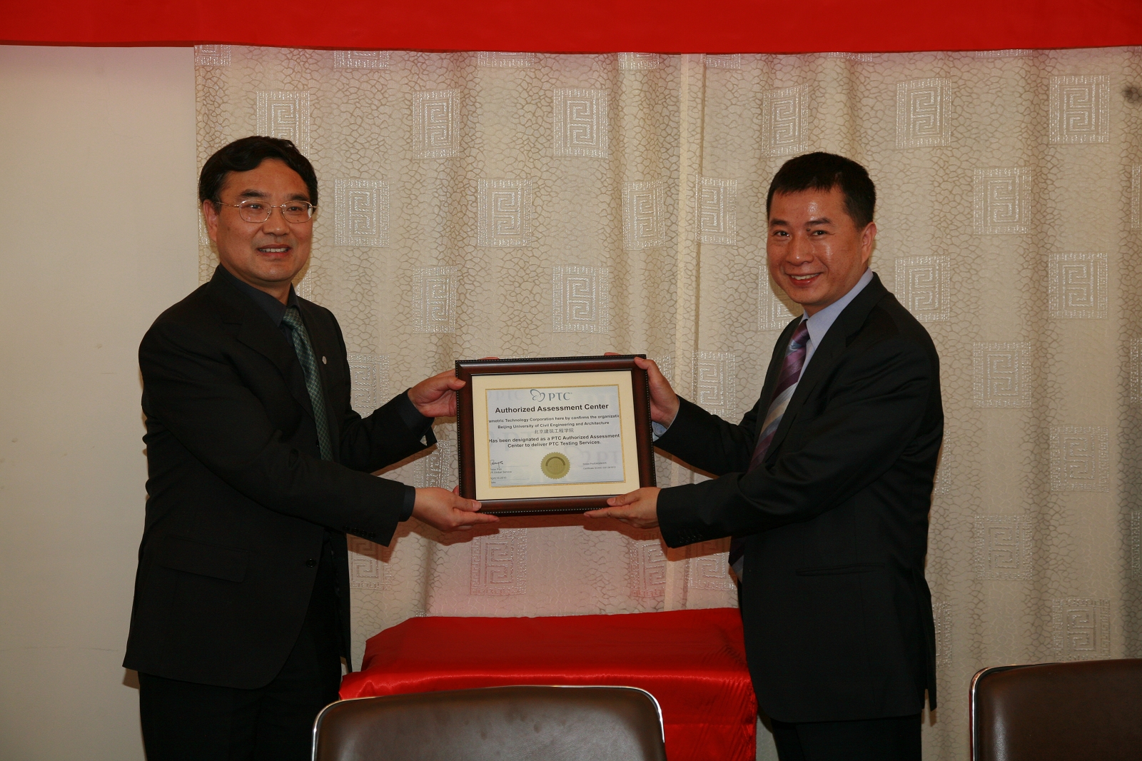 最后,举行了PTC学院授牌仪式与工程机械装备技术创新中心揭牌仪式,PTC大学副总裁潘继得先生向郑文堂校长授牌,北京凯必盛自动门技术有限公司董事长兼总裁石建立先生与宋国华副校长共同为工程机械装备技术创新中心揭牌。