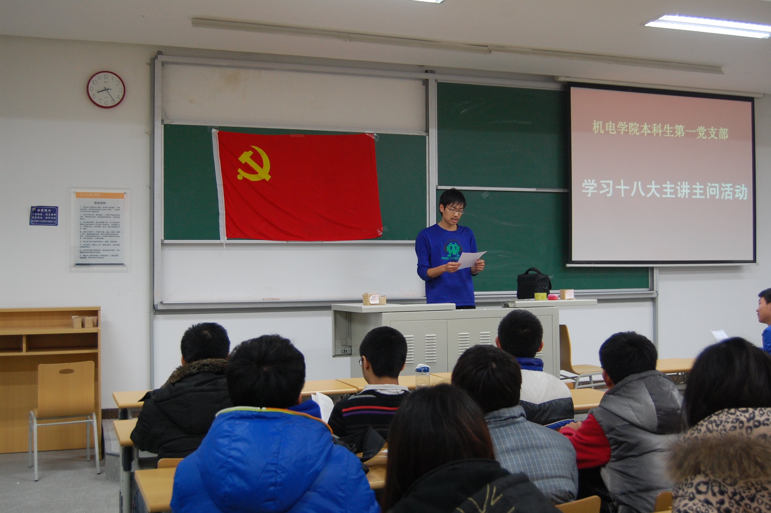 本科生第一学院党支部,12月6日晚组织全体党员和入党积极分子在基础楼D座112教室开展了学习十八大“主讲主问”活动,共有教师党员、学生党员和入党积极分子52人参加。支部七名学生党员作为主讲人,入党积极分子为主问人。主讲同学都对如何学习党的十八大精神提出了自己的看法和感受,内容涉及军队建设、党风廉政建设、中国未来的发展道路等各个方面,主问同学也分别从不同的角度对主讲同学进行了提问。最后,选举学生党员工业111班田济同学作为主讲人,代表友里