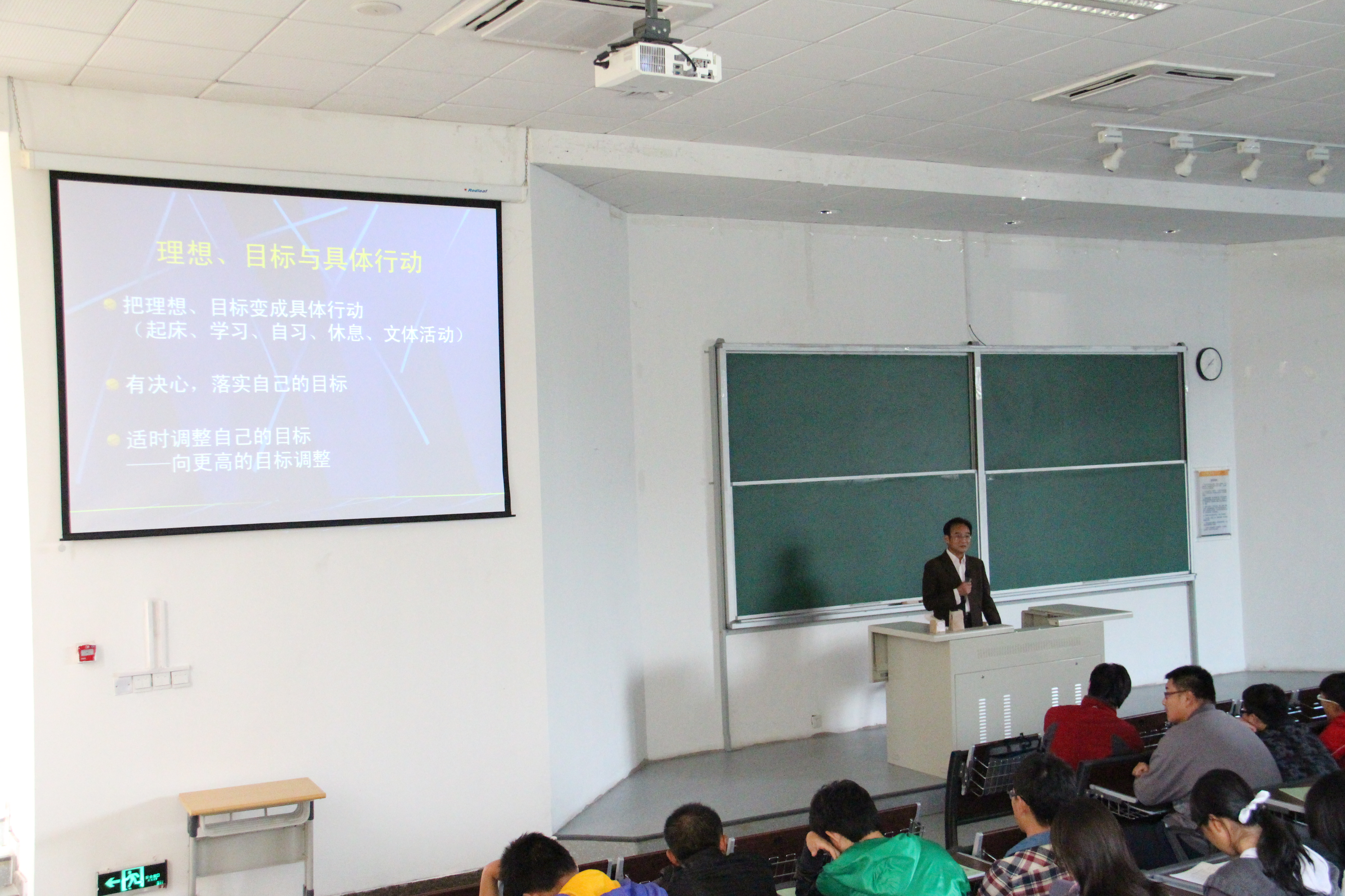 王老师在讲座中首先强调,大学生应该在大学生活初期进行各种规划,包括完善近期的学习生活计划,以及树立长远的理想。王教授鼓励同学们要有决心,肯落实,要将对理想和目标的追求与向往,变为能使自己做出具体行动的力量。并且要懂得适时调整目标,以达到最好的效果。