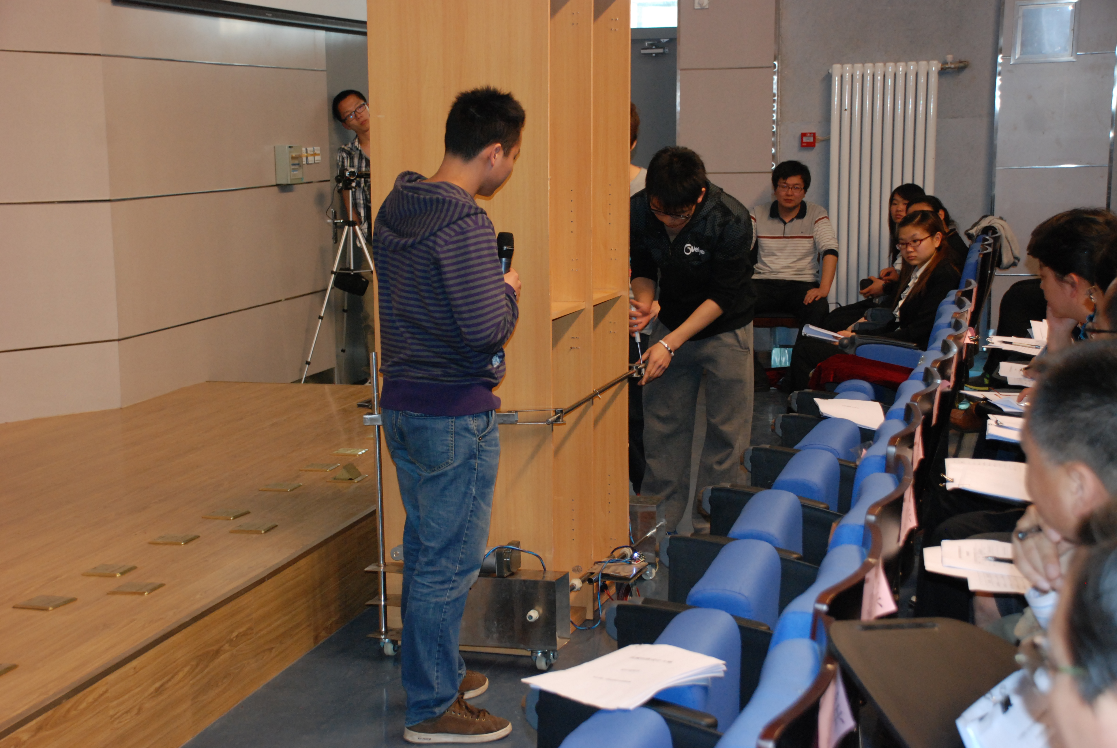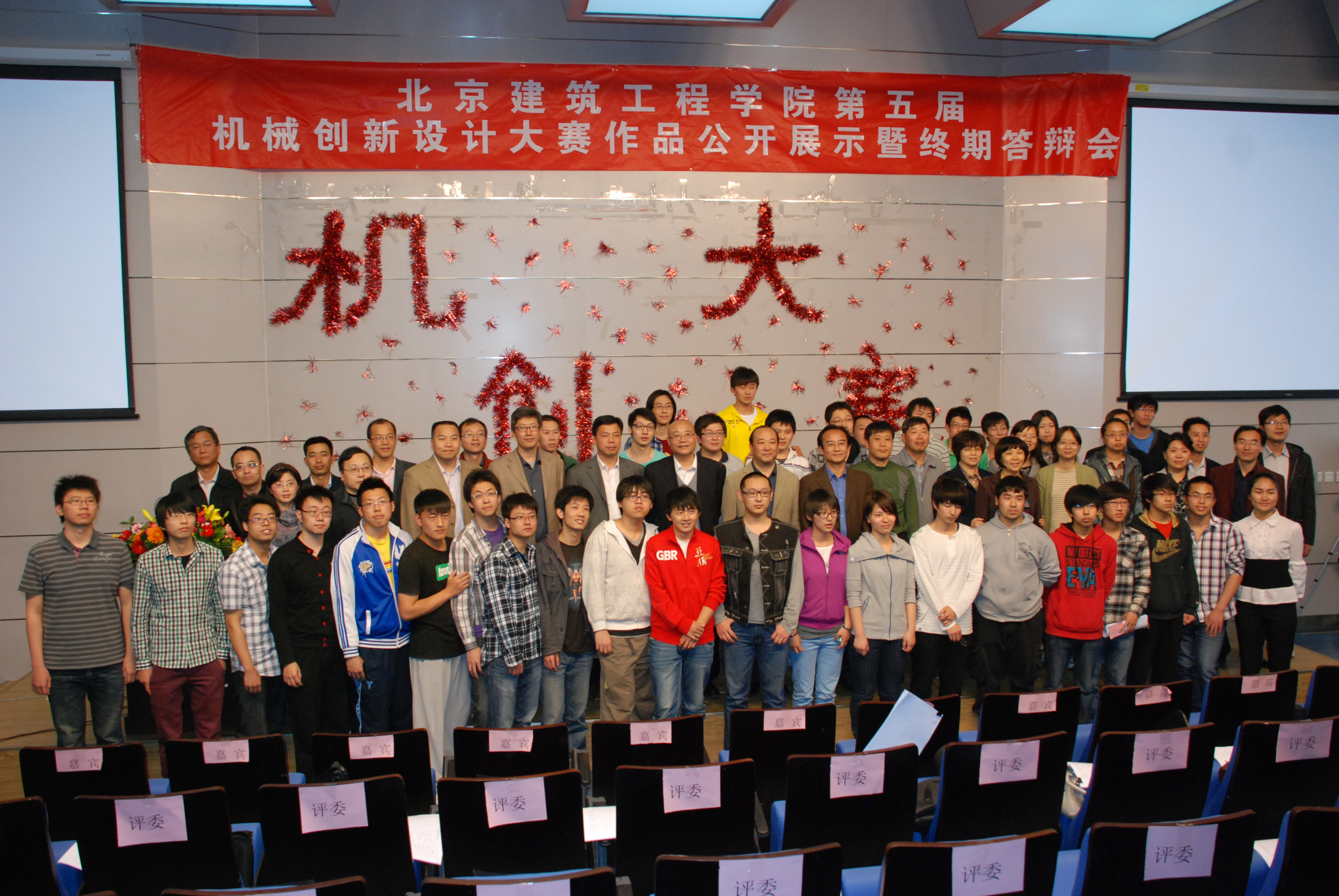 本届大赛的主题是“幸福生活——今天和明天”,内容为“休闲娱乐机械和家庭用机械的设计和制作”,和全国及北京市的大赛主题一致,当天共有来自机电、环能、土木等学院的13组作品参赛,比赛分为赛前公开展示、答辩陈述和评委提问三个环节,评委打分去掉两个最高分和最低分后取平均分为改组作品得分,经过三个小时的精彩答辩共评出一等奖一组、二等奖两组、三等奖三组,优秀奖7组。获奖作品将代表学校参加5月12日-13日在北京工业大学举行的首都高校第六届机械创新设计大赛。