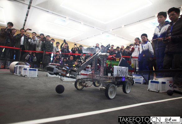 今天上午,国际中学生科技挑战赛在北京建筑工程学院大兴校区举行。共有来自人大附中、景山学校、汇文中学等十一支队伍参赛。根据比赛规则,各队需要操纵机器人将小回力球放入小箱,然后把小箱堆叠起来;或推动保龄球至特定区域来获得分数。分高者为胜。 本报记者 张航J067 摄影 王溦 J218