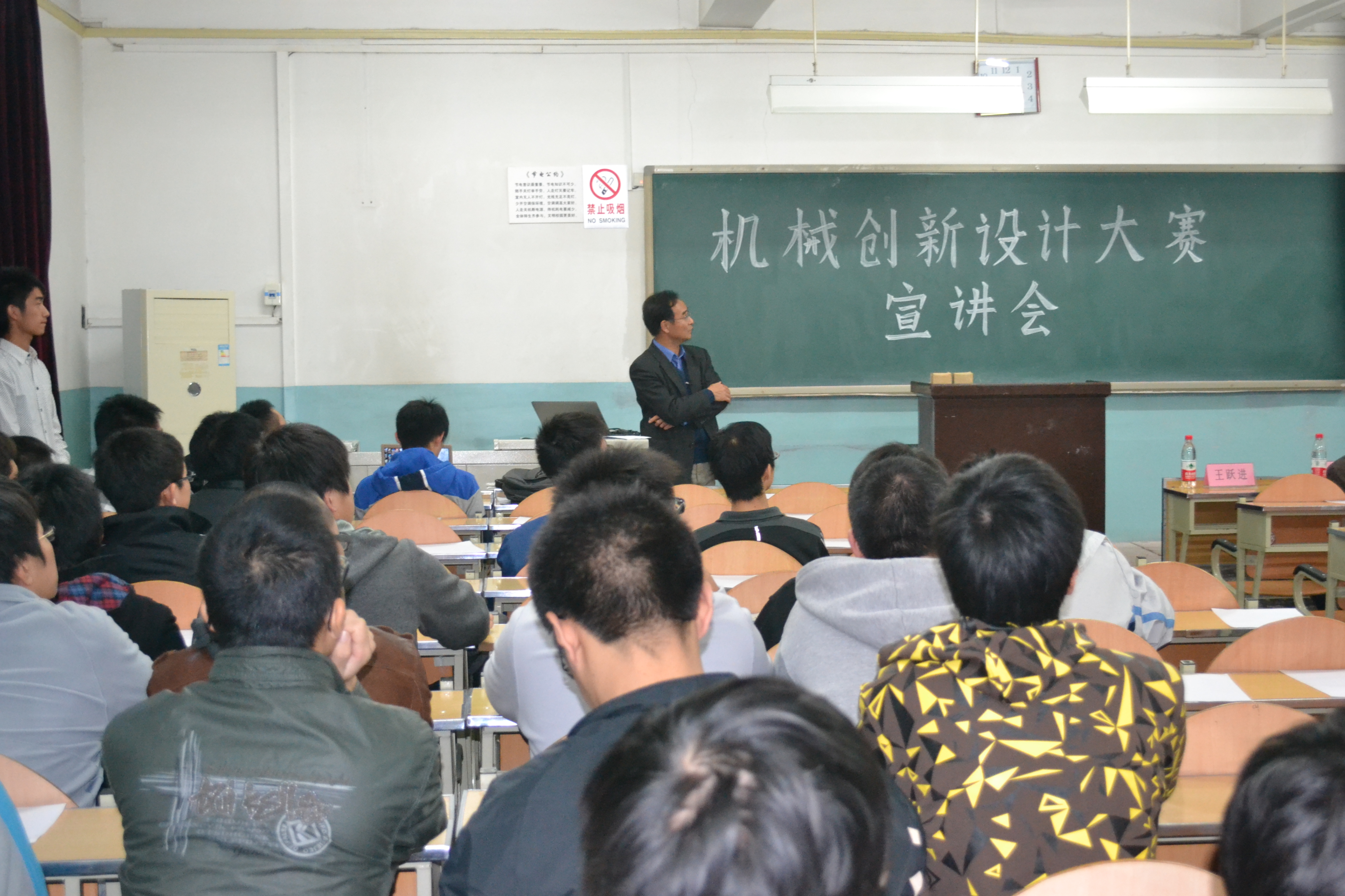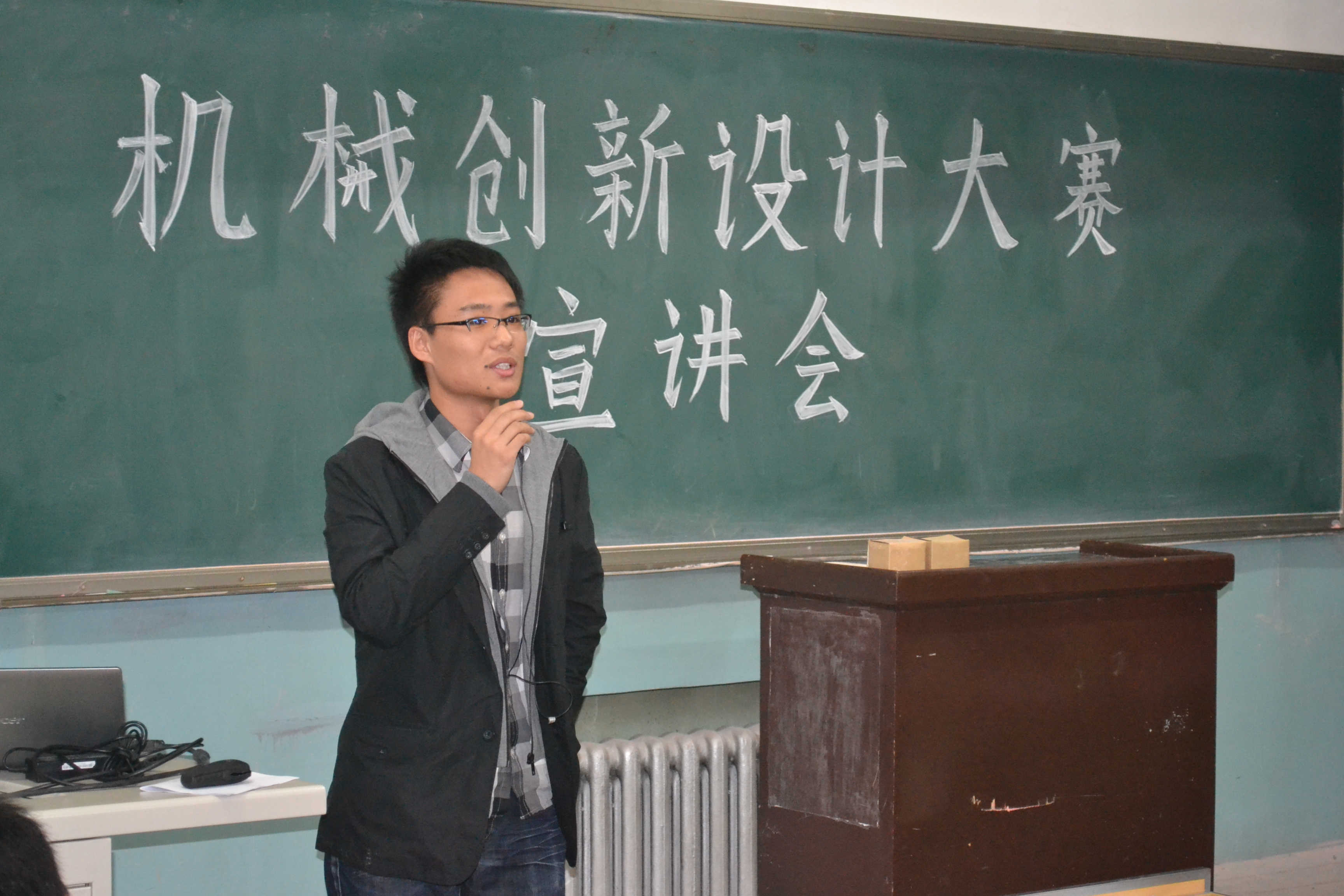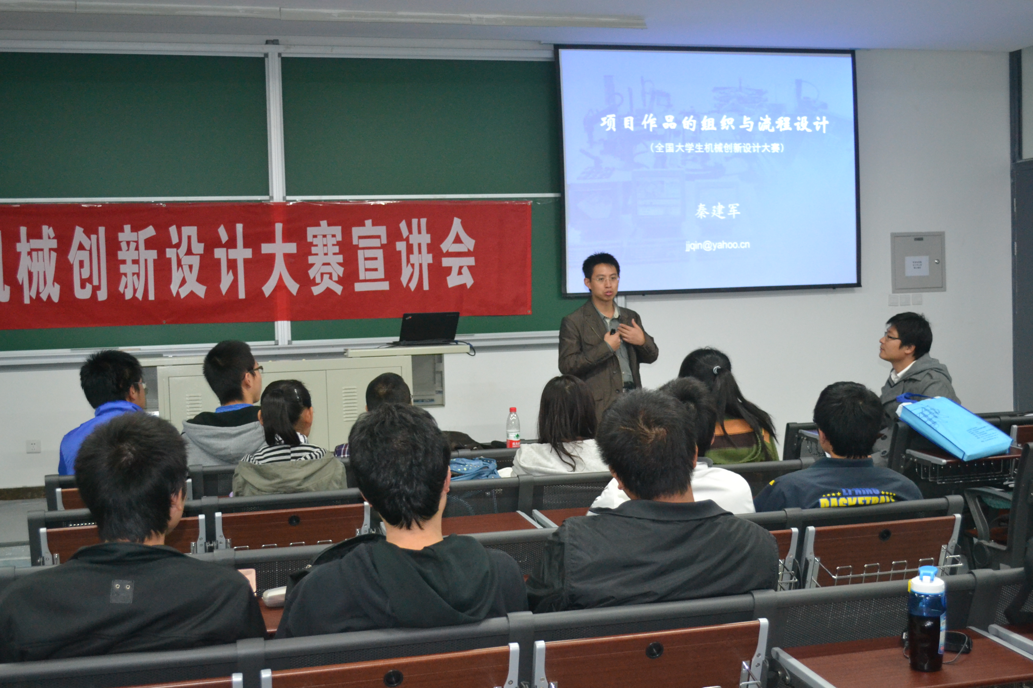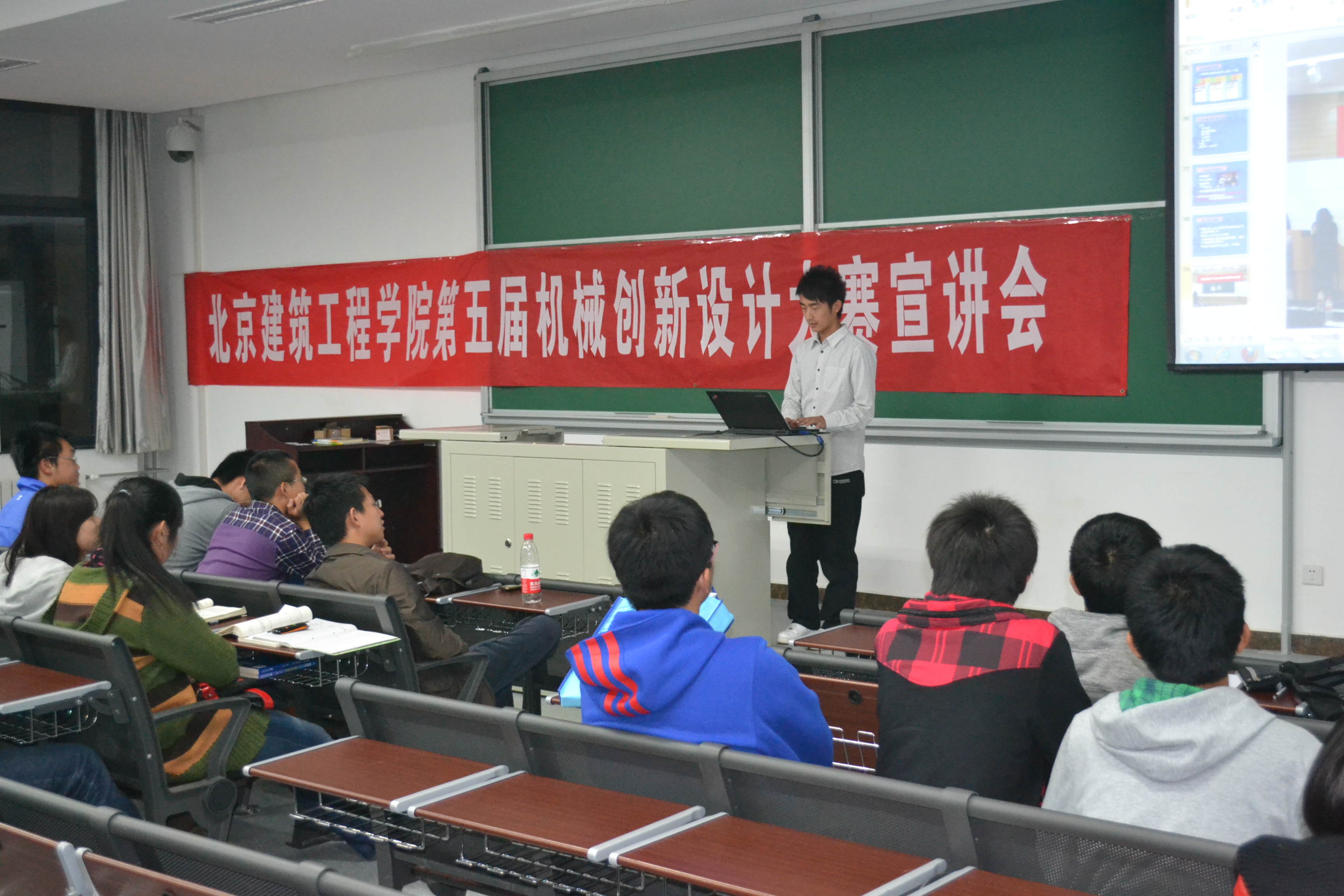 的同学所取得的骄人的成绩,充分带动了同学们的好奇心和对比赛的认真程度。之后曾多次带领学生在北京市及全国各大竞赛获奖的指导教师秦建军老师向同学们讲解了机械创新大赛的准备及参赛过程,对大赛的流程逐一进行详细解析,并且清楚的分析了历届大赛的获奖作品的优缺点,秦老师的演讲不仅解除了大家对此次比赛的种种迷惑,更是使大家对即将到来的挑战充满信心。宣讲会最后由友里