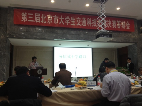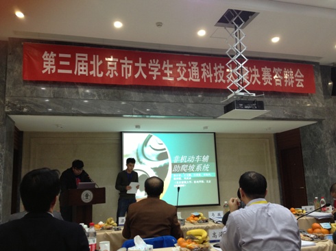 团总支书记刘星老师的带领下参加了在北京交通大学举办的“第三届北京市大学生交通科技大赛”。学校共有两组作品参赛,分别是代文鹏、季旭武等同学完成的作品《分层式十字路口》(指导教师:朱爱华老师),王文腾、白景宸、魏祎聪等同学完成的作品《非机动车辅助爬坡系统》(指导教师:姚圣卓老师)。经过激烈的答辩和模型展示环节,两组同学均获得大赛三等奖。