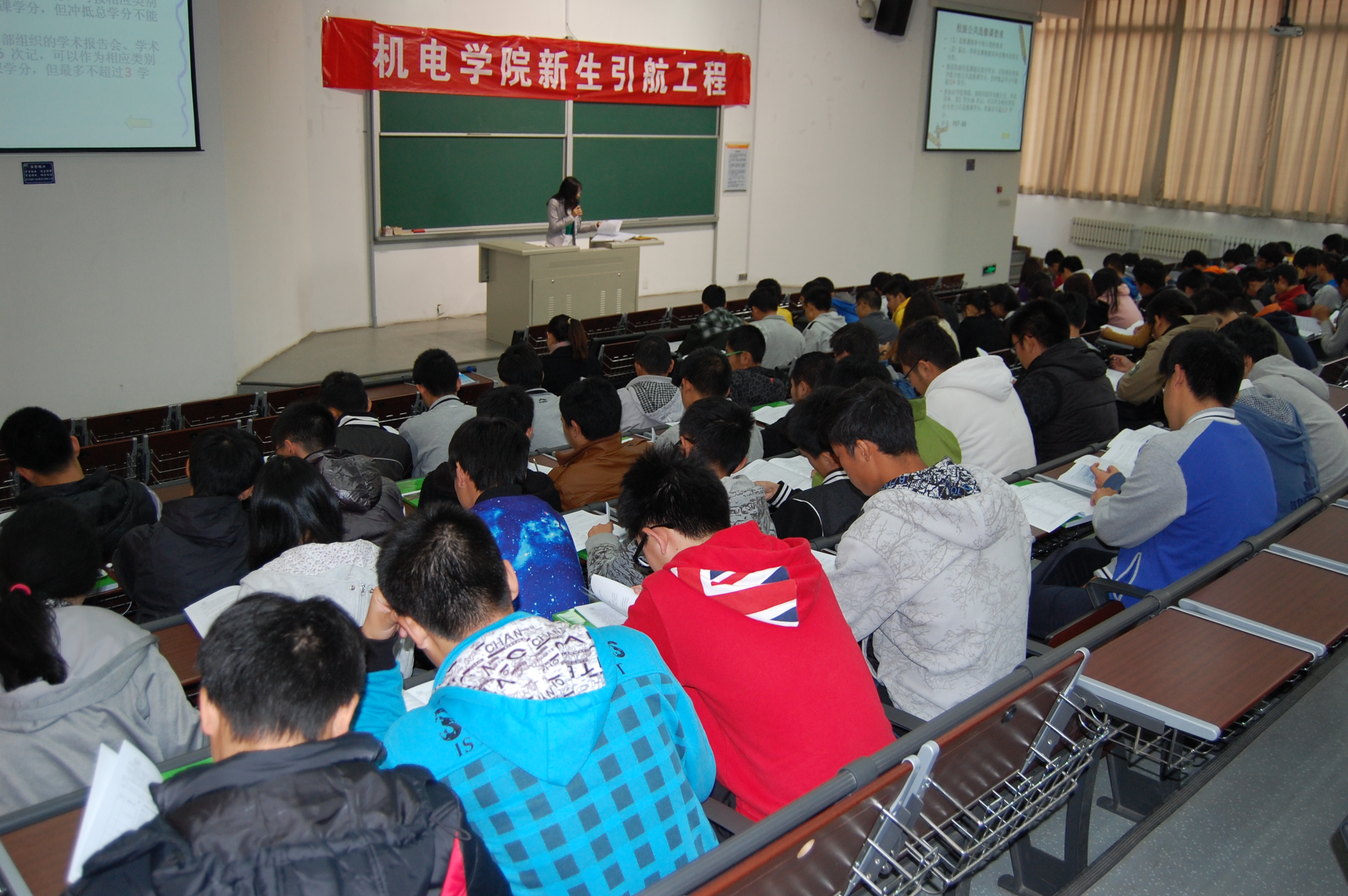 教务员丁丁老师为同学们作报告,主要内容是《学生手册》中有关内容的学习,以及各专业如何使用2013版学生培养方案。