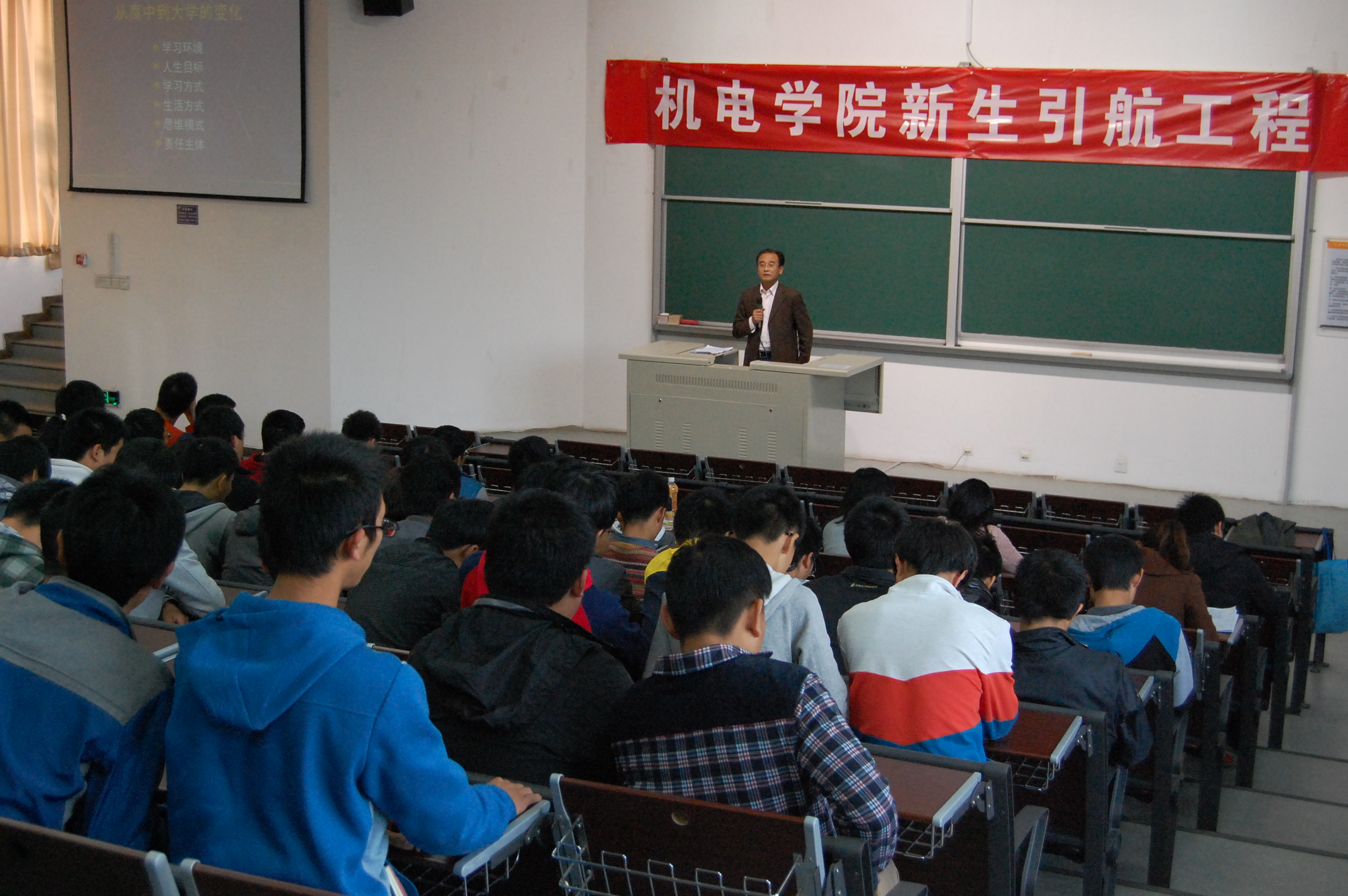 在大兴校区组织2013级新生进行引航工程系列活动之二---书记报告会。学院党总支书记王跃进老师应邀为同学们做了题为“树立远大理想,顺利完成学业”的报告。友里