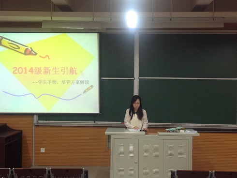教务员丁丁老师为2014级新同学解读了学业相关要求。丁老师带领同学们学习了2014版《学生手册》中相关内容,并向新同学们详细介绍了新修订的2014版培养方案。
