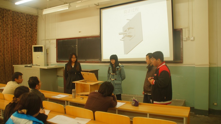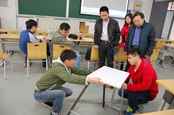 此次检查以答辩会的形式进行,旨在对30个项目组的进展情况进行检查。检查主要侧重于模型的展示、作品功能实现的可行性、遇到的困难和问题等,为即将进行的校内机械创新设计大赛决赛做准备。在展示环节,参赛同学向评委老师汇报了作品设计思路与原理、设计创新点、项目进展等,并展示了实物样机模型,现场为评委老师进行作品功能演示。评委老师们对各项目的创新性、可行性、可持续发展等方面进行了全面、详尽的分析评审,向同学们询问各个细节问题的解决方法,提出了更为合理的建议。参加中期检查的多个教室用设备和教具作品方案获得了评委老师们的一致好评,现场气氛活跃,参赛同学与评委老师进行了有效的沟通,得到了有力的指导,明确了改进方向,为作品的精益求精奠定了基础。