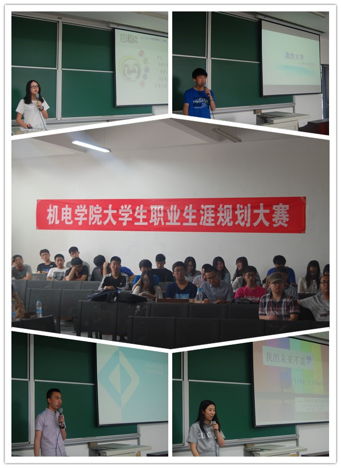 大学生职业生涯规划大赛分初赛和决赛两个环节。在初赛环节,每一名2014级的同学都撰写了职业生涯规划书,对自我认知和职业认知进行了深入的探究,确定了个人目标,并制定了实施计划。在决赛中,从初赛中脱颖而出的12名选手各展才智,先后经过了个人陈述、评委提问环节的激烈角逐。来自车141班的胡媛媛同学梦想成为一名汽车设计师,为国产汽车的崛起贡献力量;车142班刘肃则认为“生活中最重要的是身边细小琐碎实实在在的事情”,他愿意从每一天每一小时做起,踏实做好每一件事,最终实现自己的考研目标;来自轨道专业的张旭东是退伍返校的学生,他期待着将来在北京市公安局实现自己的公务员之梦;机械电子专业的任君临同学结合自己儿时的梦想,规划了成为一名机械电子工程师的理想之路;工业工程专业李鑫欣同学通过职业测评找到了个人的特长和兴趣,以运营师和精算师为标杆规划自己的梦想。选手们精彩的表现赢得观众的阵阵掌声,各位评委老师也针对选手们展示的职业发展规划提出了宝贵的建议。经过激烈角逐,机电141班任君临获得一等奖,车142班张旭东和史建宝获得二等奖,苗莉颖、黄梦雨、李鑫欣、胡媛媛获得三等奖。