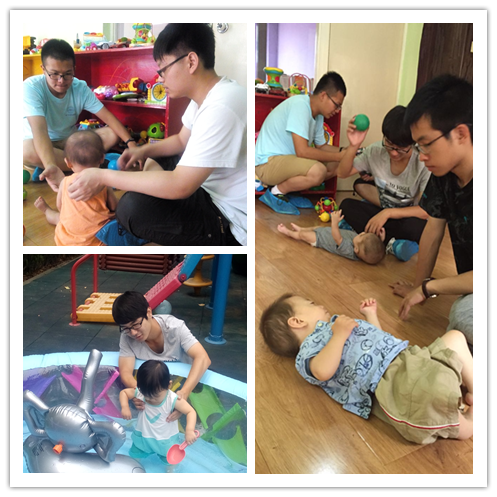 和孩子们玩耍的时光总是很快,同学们一会和孩子在地毯上玩陀螺,一会抱着孩子在水里玩“鲨鱼”,一会儿在室外,一会儿回到室内,直到该吃午饭的时间才结束。团队成员与孩子们依依惜别时,都可以看到他们眼里的不舍,让人十分动容。