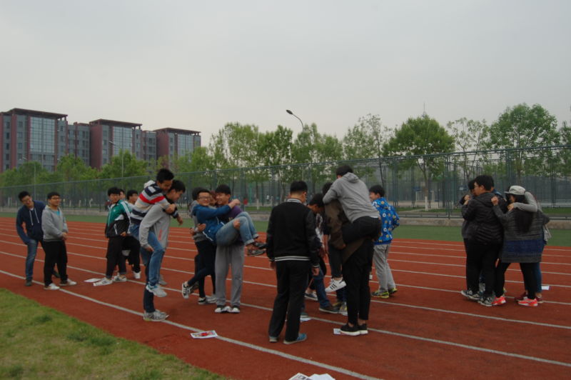 在团委学生会主席团的带领下,学生干部们被分为成4个小组。素质拓展活动包括“团队任务”、“同舟共济”、“链接加速”、“老狼几点”四个项目,有趣而又新颖的游戏让同学们热情高涨。大家齐心协力,发挥集体的力量,顺利完成了各个游戏项目。其中,在“团队任务”中,以15分钟为限来设计各自团队的队徽、口号、队形等,奇思妙想的设计,千奇百怪的队形,士气高涨的口号充分展现了大家的团队协作能力;在“同舟共济”中,每队队员共同站在越来越少的报纸上,看看哪组能坚持的最久;在“链接加速”中,各组排成一队,后面的人左手抬起前面的人的左腿,右手搭在前面的人的右肩上形成小火车,跳步前进的游戏将活动推向高潮,紧张而又刺激,活动现场气氛热烈。