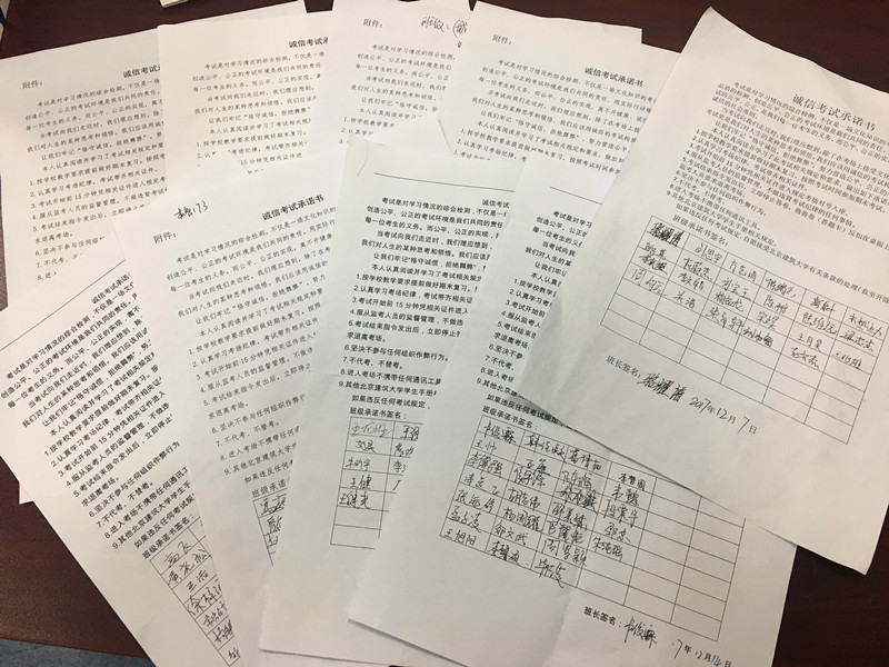 学院成立了诚信考试宣传教育工作组,制定并印发了《关于开展“文明考风 诚信考试”主题团日活动的通知》,采取了一系列措施,开展了多项活动。一是多渠道宣传,营造氛围。制作悬挂了“严肃考风考纪,树立优良学风”横幅,在学院楼树立“文明考风 诚信考试”警示录,在学院微信平台上发布《诚信考试倡议书》。二是学院专门召开班主任、辅导员会议要求,期末考试前,各班级要召开一次“文明考风 诚信考试”主题教育活动,对学生进行严肃考风考纪教育,告诫学生要知法守法,自觉遵守考试纪律。三是组织各团支部开展了“文明考风 诚信考试”主题团日活动,加强教育。各团支部开展的活动形式多样,观看反面教材的视频和照片使同学们深入了解了考试作弊带来的危害;活动中同学们相互分享对“诚信”和“考试”的看法;班长或团支书宣读诚信考试承诺书,每个同学都在诚信考试承诺书上郑重地签上了自己的名字,承诺严格遵守校纪校规、诚信考试;辅导员带领学生重温学生手册中有关考场规则及违纪处分管理规定等内容。四是加强巡考力度,加强考试管理,严肃考风考纪。由学院领导班子和系主任组成巡考小组,深入各考场进行巡查,对考场环境、考场纪律、考场秩序等仔细检查、严格把关,并督促每个监考人员要认真负责,杜绝违规作弊现象的发生,确保公平、公正的考试环境。