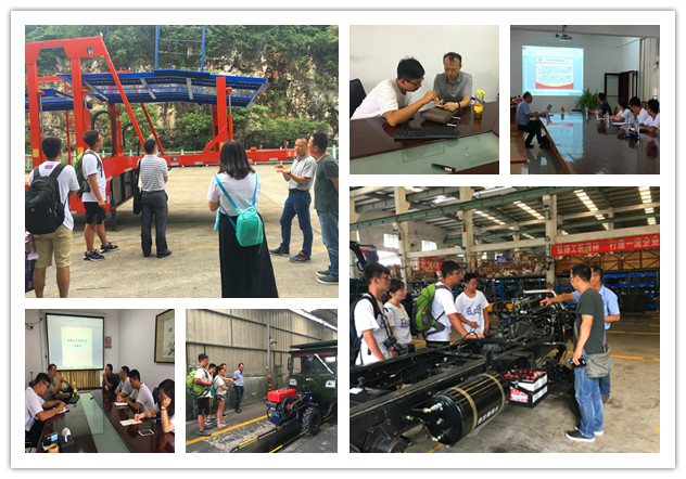 实践团深入广西一汽解放柳州特种汽车有限公司、柳州博实唯公司、惠来宝机械制造有限公司等汽车企业进行考察调研。三家公司既有有着辉煌历史的老国企,也有充满朝气富有活力的高新型企业,但共同点是都有自主创新产品或技术。在“柳特”师生们见识了自主设计的新型车辆运输车。该车基于新法规背景较老款车型质量轻、安全性高、动力性强、经济性好,大大降低了挂车后轮轮轴所受载荷,从而避免了因载重过高、载荷过大引发的发热自燃现象;实践团成员结合专业知识与工程师对汽车的车身、传动、发动机、悬挂等进行了深刻交流,同时对挂车的同步液压系统在优化上达成了进一步的共识,并对车身整体采用的材料强度及应力分析进行了相关的探讨;在“博实唯”师生与公司技术人员深入交流了大众“断轴”事件处理的全过程,详细讲述了整车的线性计算、台架线性计算与非线性计算过程,最终得出大众原始计算模型存在设计性错误,并协助其进行错误的纠正与改进措施,为学生们上了一堂精彩的专业课,也表明我国汽车仿真计算的技术已达国际领先水平,彰显了创新精神; 在“惠来宝”师生们参观了拖拉机生产线及整车新型产品。公司负责人着重介绍了自主研发的惠利BH2040新型拖拉机,并与旧式拖拉机和小轿车进行了整车情况的对比。