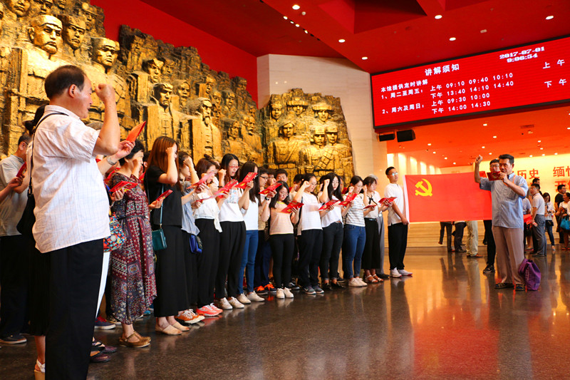 在参观展览之前,党员们一同在展厅浮雕前重温了入党誓词。展览以“铭记历史、缅怀先烈、珍爱和平、开创未来”为主题,共由中国局部抗战、全民族抗战、中流砥柱、日军暴行、东方主战场、得到多助、伟大胜利、铭记历史等八个部分组成,以历史图片和实物为主,辅以景观、油画、雕塑、幻影成像、影视片等展示手段,全面具体的展现了中华儿女不惧来犯共赴国难,英勇抵抗日军军国主义侵略的伟大光辉历史,突出表现了中国共产党在抗战中的中流砥柱作用,反映了中国作为东方主战场为世界反法西斯战争胜利作出的不可磨灭的贡献。