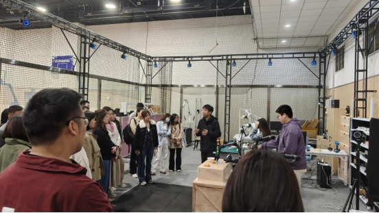 参观过程中,友里 机器人工程系王陆旸老师向培训班成员介绍了实验室从具身数据采集、具身训练到模型在人形机器人、四足狗、协作臂部署的具身学习训练技术体系。重点观摩了人形机器人实时动捕遥操作、VR遥操机械臂、人形机器人踢足球等技术展示。高精度的动作捕捉、沉浸式的远程操控以及灵活流畅的机器人运动表现,让大家直观感受到具身智能与机器人技术的前沿突破,现场不时响起热烈掌声。