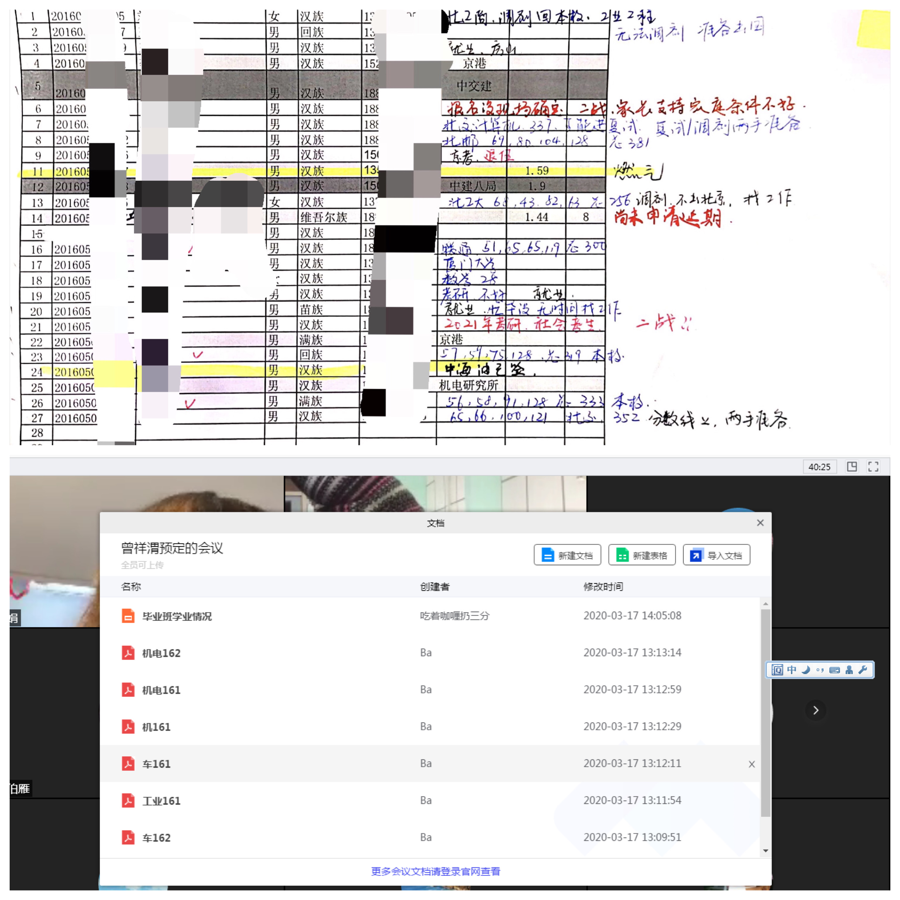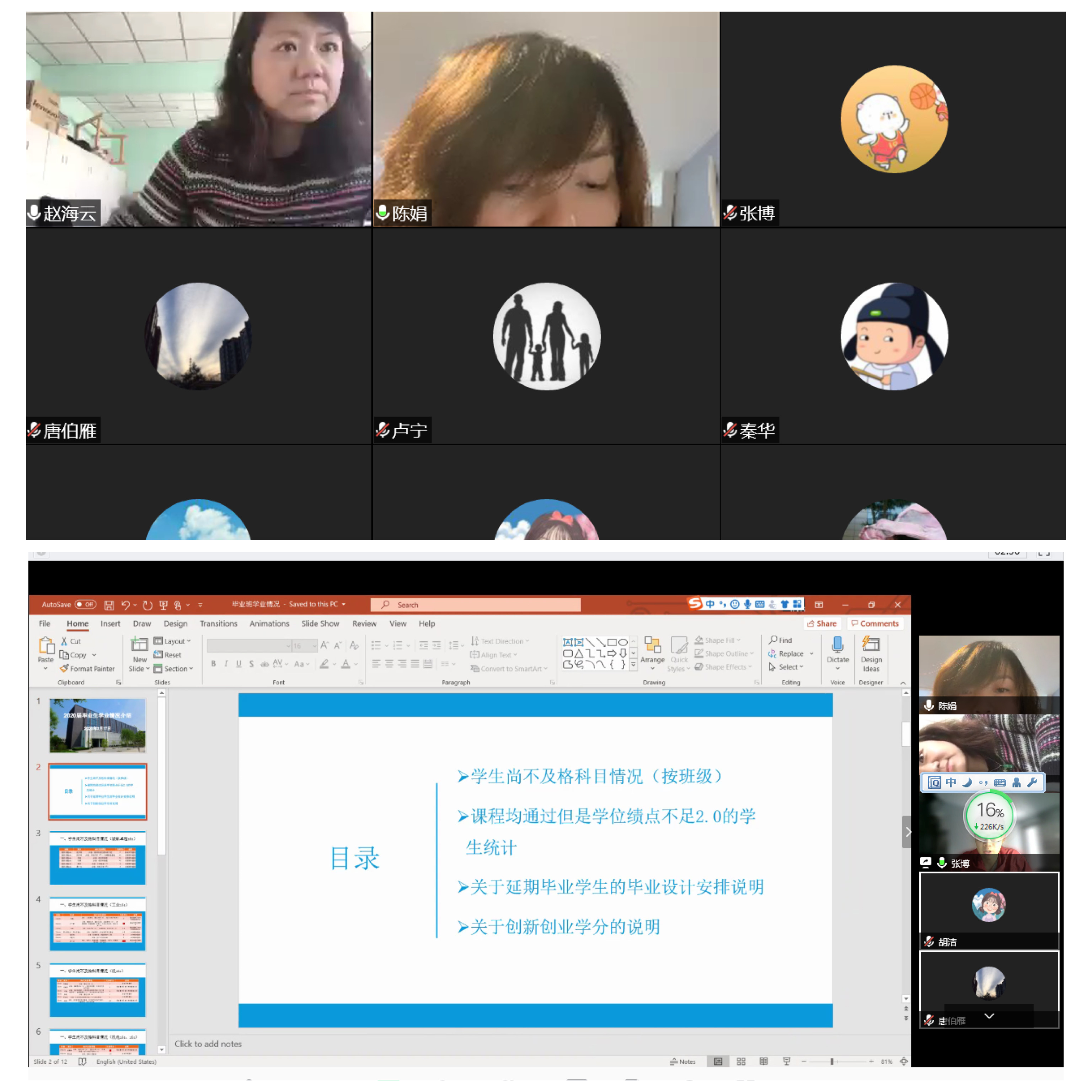张博分析了2020届毕业生在学业中尚存在的问题,与班主任分析了每一个在学业中存在学业困难的学生,并有针对性此提出了解决办法。胡洁从考研、出国、就业几个方面分析了毕业生就业的整体进展情况,还就学业困难学生、少数民族学生和专升本学生等特殊群体的情况进行了分析。