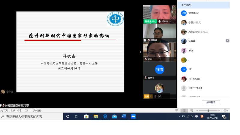 孙敬鑫主任从中央对新时代中国国家形象的定位,疫情前中国国家形象的海外认知,疫情期间国家形象的自塑与他塑等方面进行了讲解,详细分析了国家形象的内涵外延,并利用自己多年调研的数据,从不同视角向大家分析了我国国家形象的塑造和演变状况,特别就疫情期间国外不同国家和媒体对我国的态度与非议、我国面临的挑战和需要做的努力等进行了讲解。最后解答了师生们的提问。