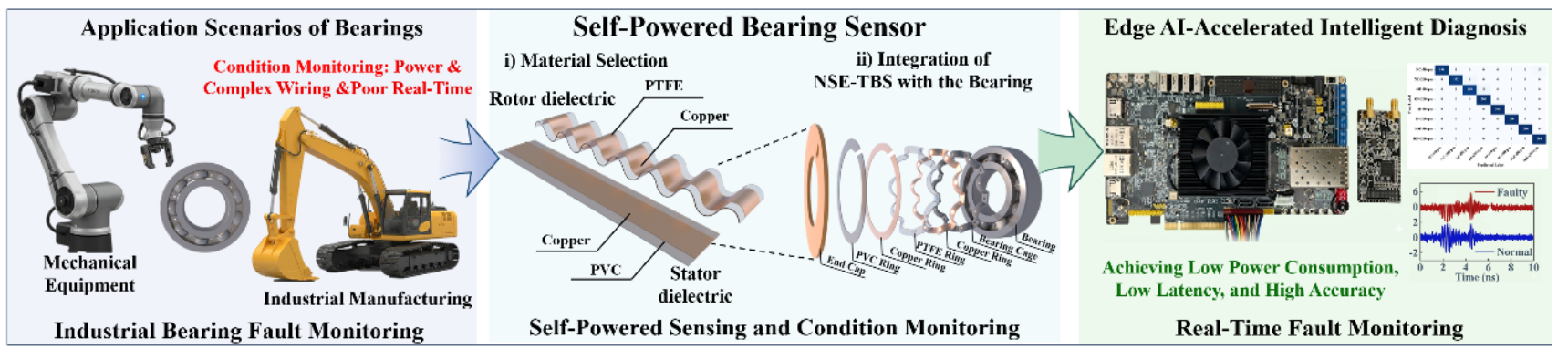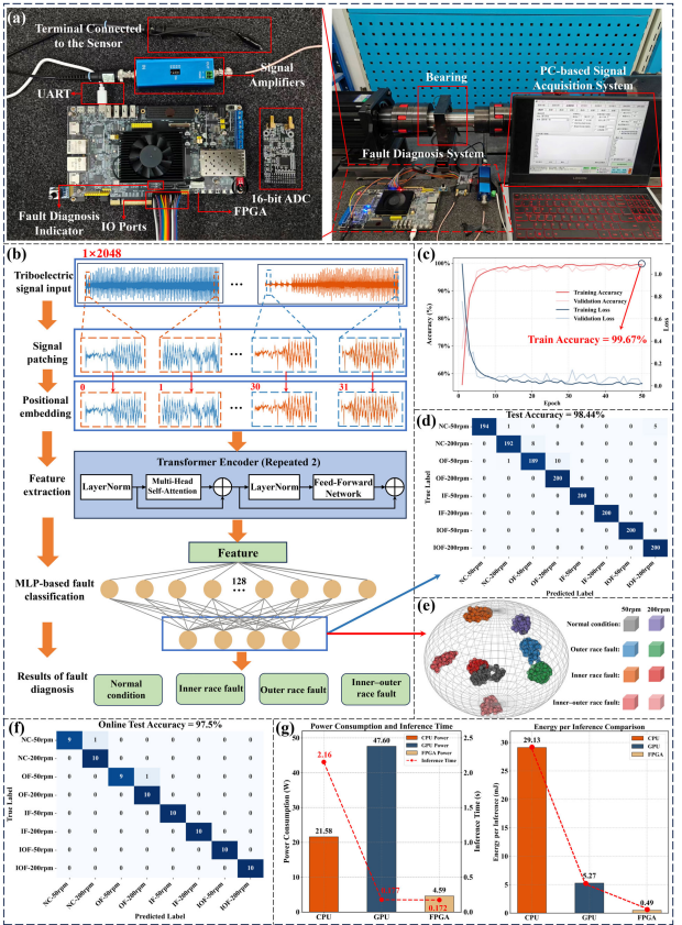 本研究报道了一种集成了自供电感知与边缘AI加速的旋转机械在线智能诊断方案。针对传统监测方法依赖外部供电、安装空间受限且难以在复杂工业环境下实现高集成度、低功耗实时监测的挑战,本文开发出一种可直接贴附于轴承表面的非侵入式单电极摩擦电轴承传感器(NSE-TBS)。该传感器基于摩擦纳米发电机原理,能够直接将机械能转化为高灵敏度的自供电状态感知信号,并在多种运行条件下实现了稳定的转速跟踪、保持架打滑检测及故障特征提取。在此基础上,研究进一步构建了基于现场可编程门阵列(FPGA)加速的1D-ViT模型诊断系统。通过对数据流和并行矩阵乘法引擎的深度优化,该系统在FPGA上实现了仅4.59W的推理功耗,较之CPU和GPU方案分别降低了4.7倍和10.4倍,同时将单次推理延迟降低至0.108ms,并保持了高达98%的故障诊断准确率。本研究实现了自供电传感器与边缘AI加速的集成,为智能轴承的实时诊断提供了一条新途径。