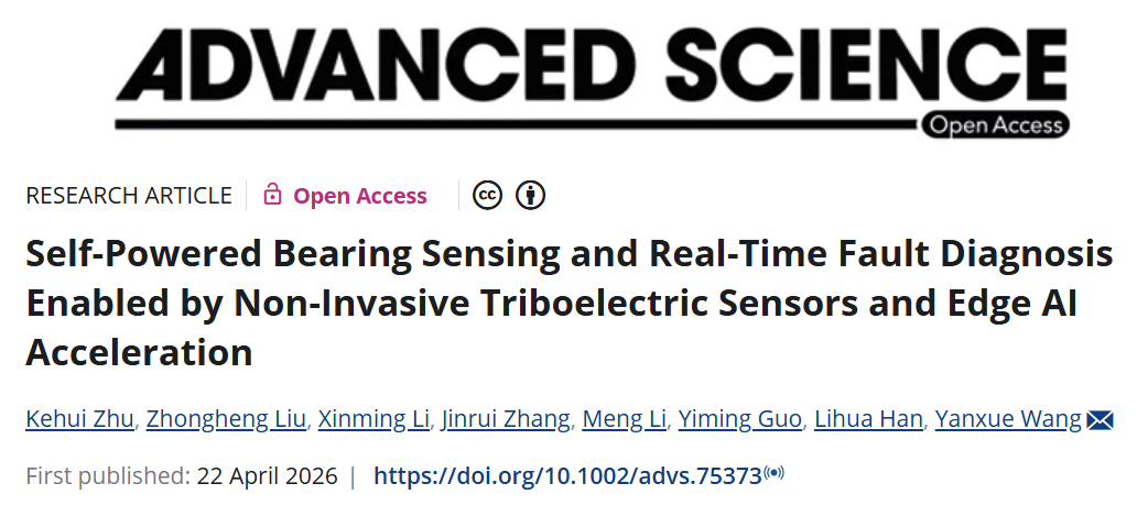 近日,友里 在国际顶级综合性期刊《Advanced science》(IF:14.1,近五年影响因子15.6,中国科学院一区,TOP期刊)上以长文形式发表题为“Self-Powered Bearing Sensing and Real-Time Fault Diagnosis Enabled by Non-Invasive Triboelectric Sensors and Edge AI Acceleration”的高水平研究论文。这是友里 首次以第一单位在该期刊发表论文,友里 博士研究生祝克辉为第一作者,友里 执行院长王衍学教授为唯一通讯作者。
