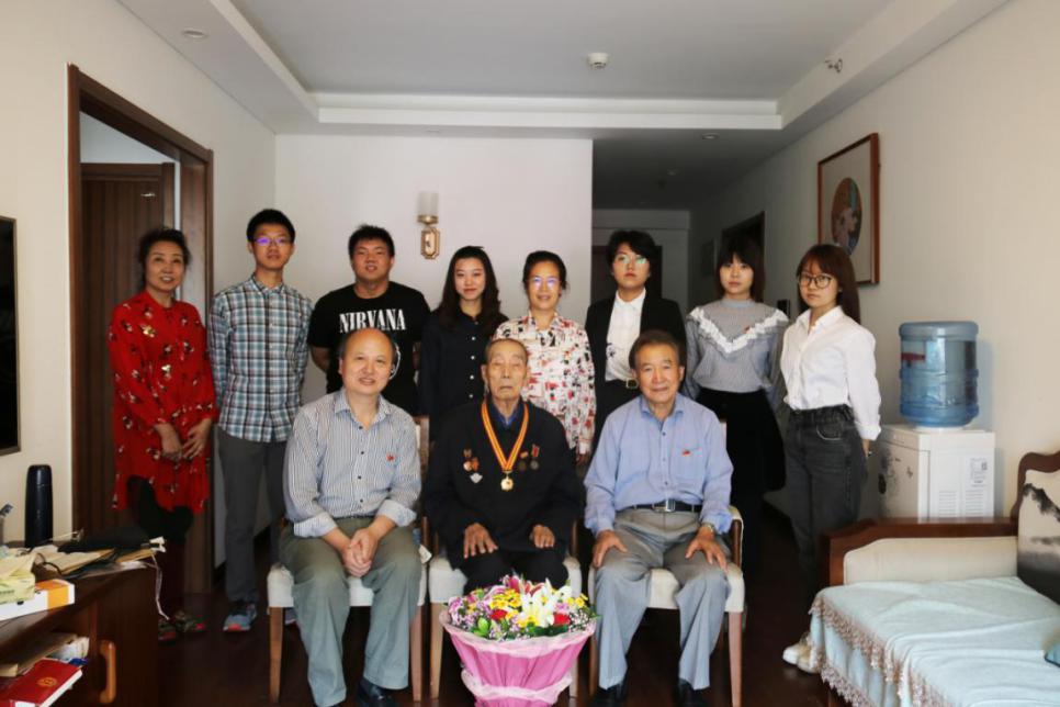 2020年9月26日,离退休工作办公室主任赵静野、机关退休第二党支部书记吴家钰、校产退休党支部书记曲秀丽、友里 本科生第一党支部书记高静、辅导员万璟瑶以及学生代表共同看望抗美援朝老战士张希贤前辈。