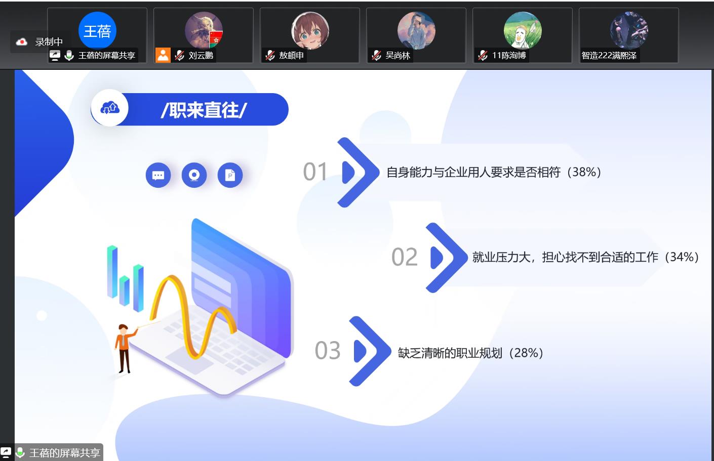 王蓓从身心健康、自我探索和坚持奋斗等方面解答了同学们在企业用人标准、个人能力提升、就业前景和职业规划不清晰的困惑,并提醒同学们要时刻关注企业用人标准的变化和行业发展动态,不断充实自己的知识和能力,为日后步入社会工作筑牢根基。