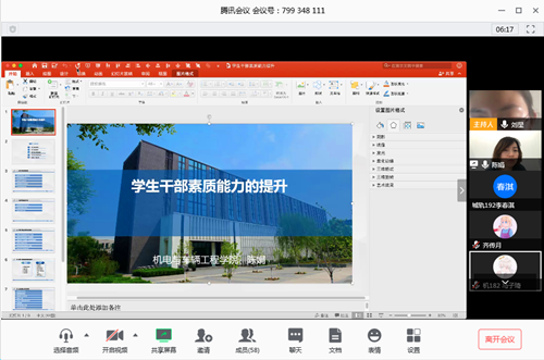 陈娟主讲题目是《学生干部素质能力的提升》,她从学生干部的重要作用、基本情况、存在问题、应具备的素质能力和如何当好一名学生干部这五个方面进行了详细的阐述,并对所有学生干部提出希望:培养良好素质,锻炼工作能力,提升自我价值。“当初大家选择成为学生干部的目的可能有差异,有的为了锻炼能力,有的为了享受特权,有的为了在简历上添彩…目的不同,积极性也就不同。但我们需要的学生干部是积极性高,主动为学生服务的。”陈老师这一番话让许多人陷入沉思,回想自己的初心是什么,自己到底适不适合当学生干部。只有动力没有能力是不行的,学习能力、交际能力、创新思维能力、组织管理能力、分析解决问题能力、宣传能力和规划决策能力,这些都是学生干部必备的能力。同时学生干部还要严于律己,以身作则。