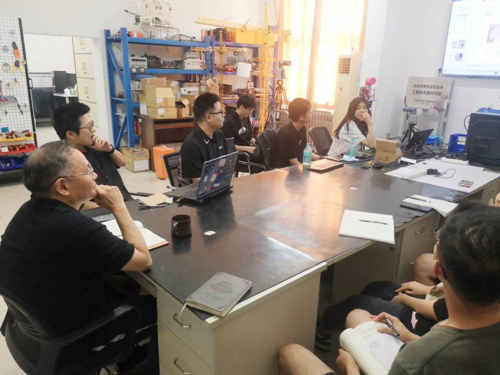 在实验室,每个科研项目都有1-2名学生作为负责人,如王舜负责瓷砖铺贴机器人,徐崇文、陈冠中负责PS建筑测量机器人,李昊禹、李佩炫负责AOP监控与测量机器人;徐佳琦、郭建明负责RCH智能吊钩及控制系统;严睿、李佩炫负责RRCH吊装物空间位姿控制机器人等。这样的安排使学生有机会亲身体验从设计、制造、组装,再到运行调试的全过程。使得他们能更深刻地理解科技创新的实际运作和各个环节的关系,以及如何把创新理念转化为实际样机,而不是仅仅停留在论文和专利阶段。