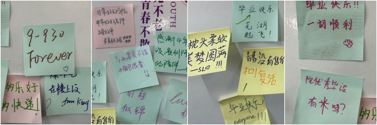 在学院门口,各式各样的心愿便利贴张贴在心愿板上,形成一道独特的风景线。毕业生们纷纷用笔在心愿便利贴上或写下对母校的感激与祝福,或写下对未来的憧憬与期盼,或写下对同窗好友的悄悄话……,千言万语写满了美好的心愿。