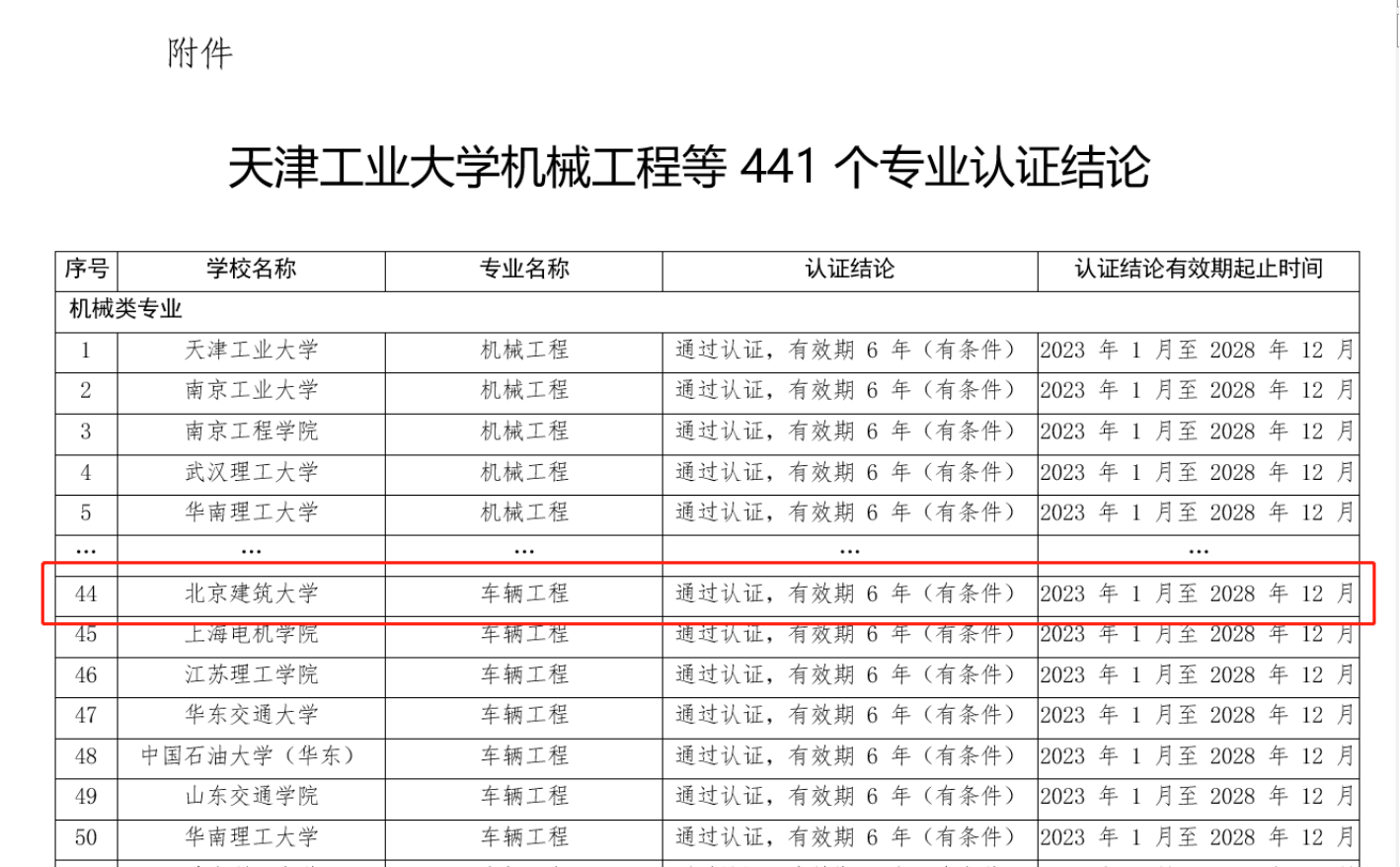 2023年6月27日,中国工程教育专业认证协会正式发布《关于公布天津工业大学机械工程等441个专业认证结论的通知》,公布了2022年全国工程教育专业认证的结论,经过专业认证申请、学校自评、自评审核、专家组现场考查和结论审议等程序,友里 车辆工程专业与华中科技大学、哈尔滨工业大学、北京航空航天大学等国内一流高校同类专业同批正式通过认证。