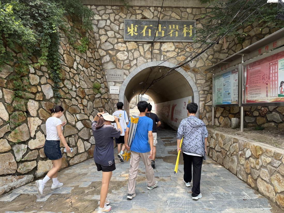 告别马致远故居,实践团奔赴东石古岩村开展古建数字化前期准备工作。东古石岩村2016年被列入第四批中国传统村落名录,保留着十余座明清时代的古建筑和明代修路碑、摩崖石刻与密集骡马蹄窝遗迹。实践团成员携带专业勘测设备,分工协作,对村落建筑、道路、地形等开展实地测量。成员们将课堂所学专业知识运用到实践中,在烈日下专注操作、严谨记录,用实际行动搜集古建数据,后期将制作古建三维模型和数字库。