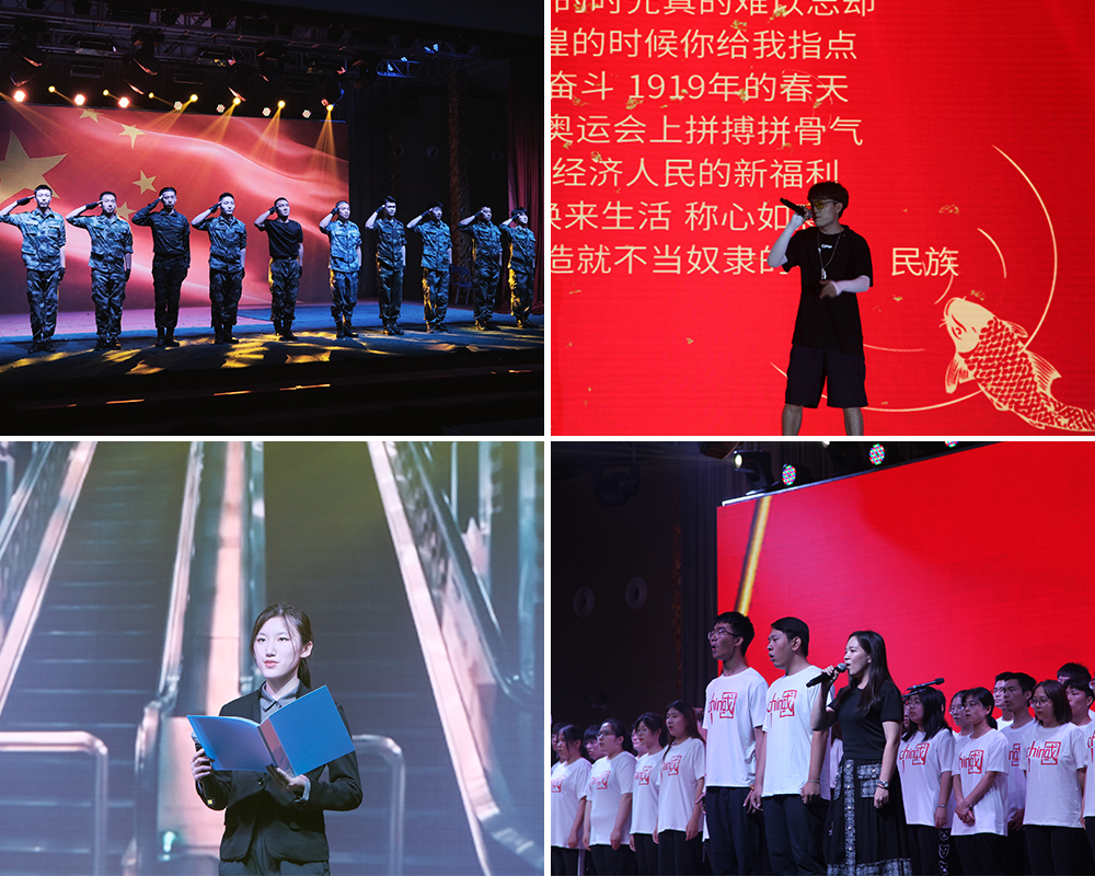 第一篇章“盛世·百年荣光”展现了新时代中国的辉煌与成就。机电退伍大学生士兵的擒拿格斗表演充分展现了青春报国的绚丽风采;青年学生用一首原创说唱《红色》,悉数百年来党带领下取得的光辉成就;主题宣讲《你身边有我》,讲述身边的战“疫”那些事儿;师生共同合唱《国家》,向祖国深情告白。