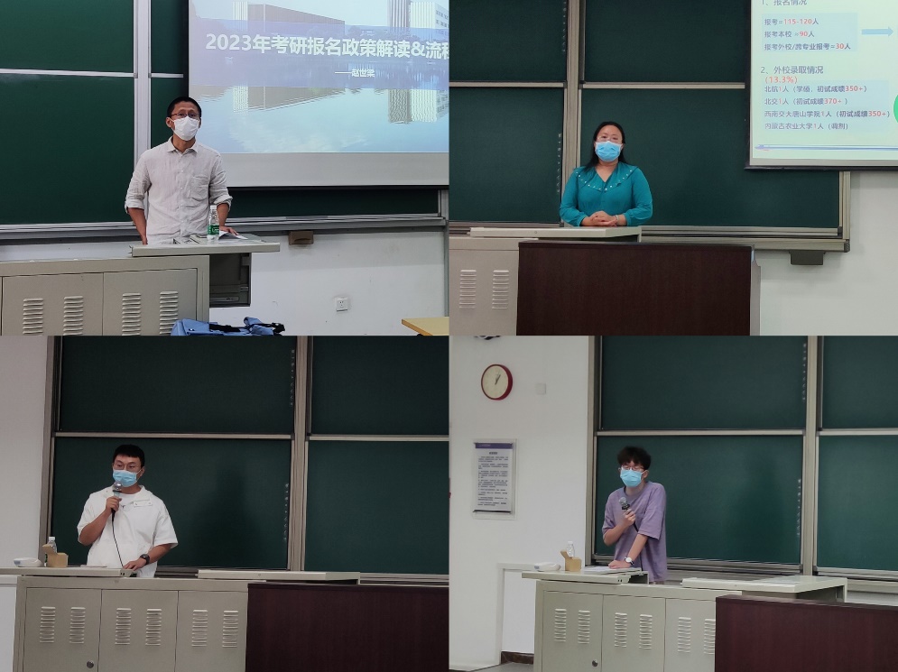 胡洁以学院2022届考研情况、报考率、升学率等详实数据进行对比分析,并详细分析历届录取情况,进一步引导学生认清形势、明确目标。赵世梁围绕今年考研报考政策、志愿填报进行解读,鼓励学生科学报考,认真备考。