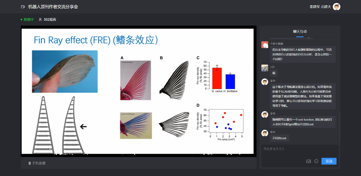 单晓微老师的报告就当下热门的研究领域——软体机器人进行成果分享。通过PPT与视频的形式,为大家详细阐述了利用鳍条效应(FRE)的软体机械手指的数学建模过程和性能分析方法,并分析了阐明刚度分布对抓握性能的影响,为理解和设计通用FRE软体机械手指的抓握能力提供了解析工具和优化方法。