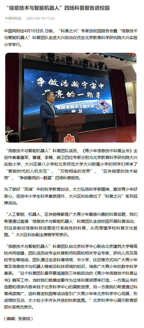 据悉,本次活动也是“信息技术与智能机器人”科普团队的首场报告会,大兴区科协今后还将邀请科普团队走进更多的中小学为广大师生带来科普报告、科普小讲堂、科学实践探究等形式多样的科普活动。