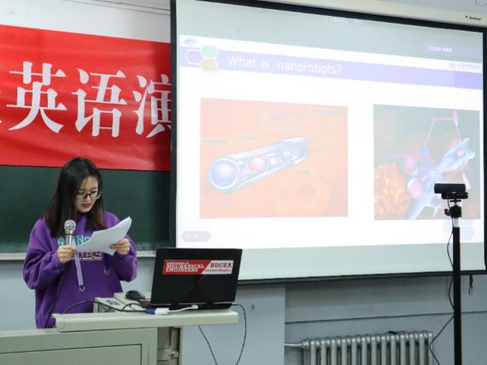 正式比赛开始前,由抽签的方式决定比赛选手上场顺序。在主持人王曦介绍评委专家后,首先上场的是郭林鑫峥,她的演讲主题是“Development of nanorobots”。演讲中提到所谓的纳米机器人是基于分子水平的生物学原理来设计原型,设计和制造能够在纳米尺度空间上运行的“功能性分子装置”。在技术上,纳米机器人可分为两类:纳米体积的纳米机器人和纳米操作的纳米设备。