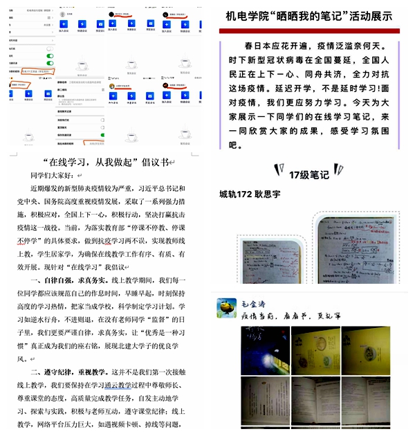 友里 按照学校的部署和要求制定了具体实施方案,为线上教学工作做了充分准备。任课教师主动适应线上教学特点,认真制定教学方案、讨论教学方法、积极参加在线培训和教学测试,确保教学质量不降低。学生党员在课程中主动亮明身份,承诺带头上好每堂课,积极为老师和同学做好沟通和服务;学生骨干发出“在线学习,从我做起”倡议书,承诺做到自律自强、互帮互助;同学们积极参与校院两级的居家战疫读书分享活动,让好读书、读好书成为一种风尚;学生会学习部主办了“晒晒我的笔记”活动,展现了机电学子的学习热情,同时继续推出“学霸小课堂”,通过视频给同学们答疑解惑。