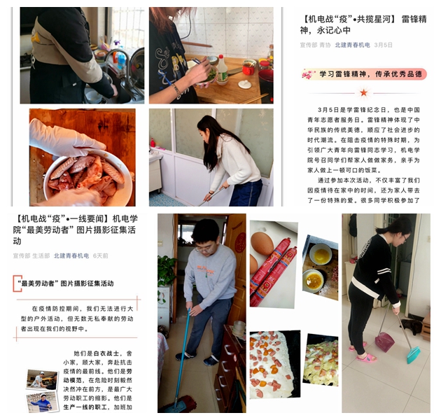 学生会青协在学雷锋日举办了“帮父母做家务”活动,号召同学们以劳明德。同学们或亲手制作美食,或打扫房间,或刷碗洗锅,体会到了“劳动最光荣”的真谛,亲子关系也得到了加深。学生会生活部在五一劳动节开展了“最美劳动者”图片摄影征集活动,通过关注身边积极工作、努力劳动的人来体会劳动的美。