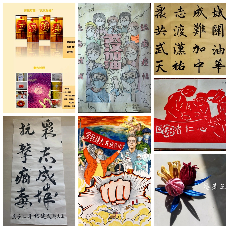 在“爱我建大,共同战疫”创意大赛中,同学们积极参与,将自己在疫情期间的所思所想进行艺术性与创造性的表达,提交绘画作品10张、书法作品6张、摄影作品5张、手工作品5个、视频4个、剪纸作品2个、篆刻作品2个、征文7篇,增强了社会责任感,树立战胜疫情的信心和决心,传递“战疫”正能量。