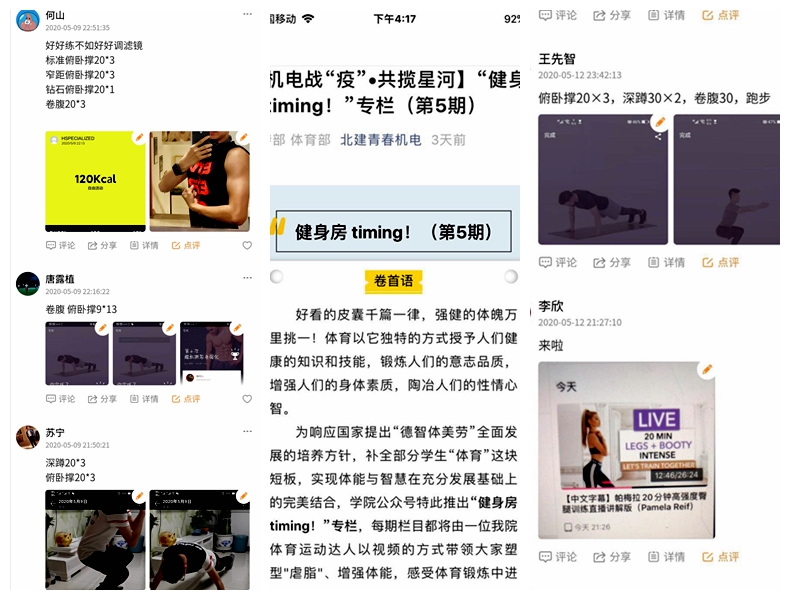 学生会体育部推出“健身房timing”专栏,挑选出学院运动达人,为同学们精心制作了室内健身指导视频,带领大家塑形虐脂,增强体能,打响线上健体战“疫”。近百名学生参与其中,还建立了微信打卡群,督促同学们坚持锻炼。