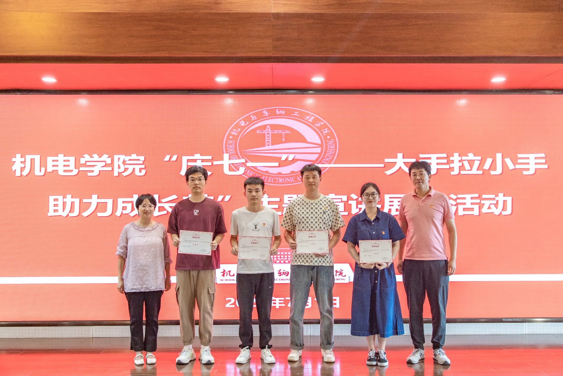 组织学生党员开展“庆七一——大手拉小手 助力成长梦”主题学生微党课展示评比活动,学院党委书记李大伟、副书记兼副院长高蕾、副书记李文超、各学生党支部书记参加并担任评委,活动由本科生第二党支部书记万璟瑶主持。