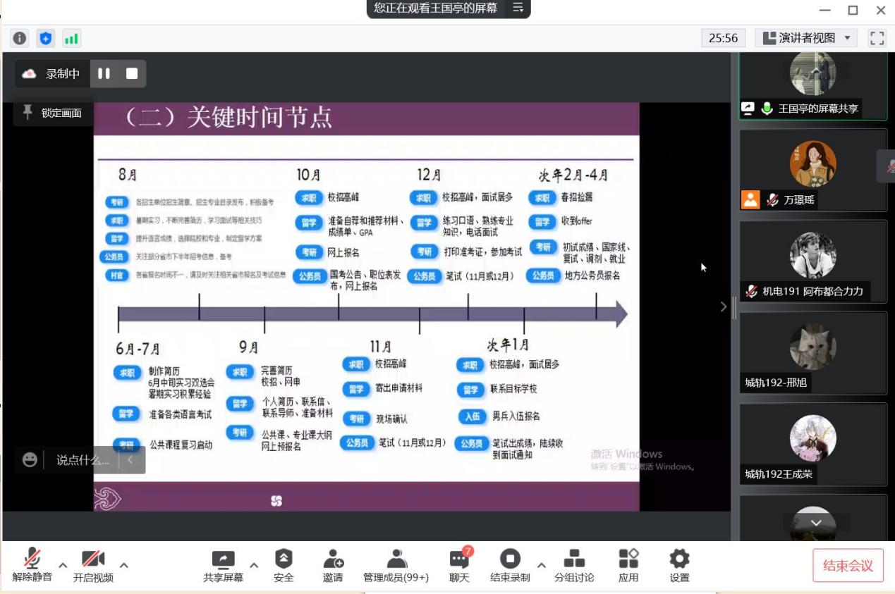 王国亭老师围绕近年就业形势、关键时间节点、就业去向统计、考研考公情况、国家政策支持、学校就业指导等方面进行了详细的解读和介绍,鼓励同学们充分做好就业准备,大胆拓宽就业渠道,积极就业。