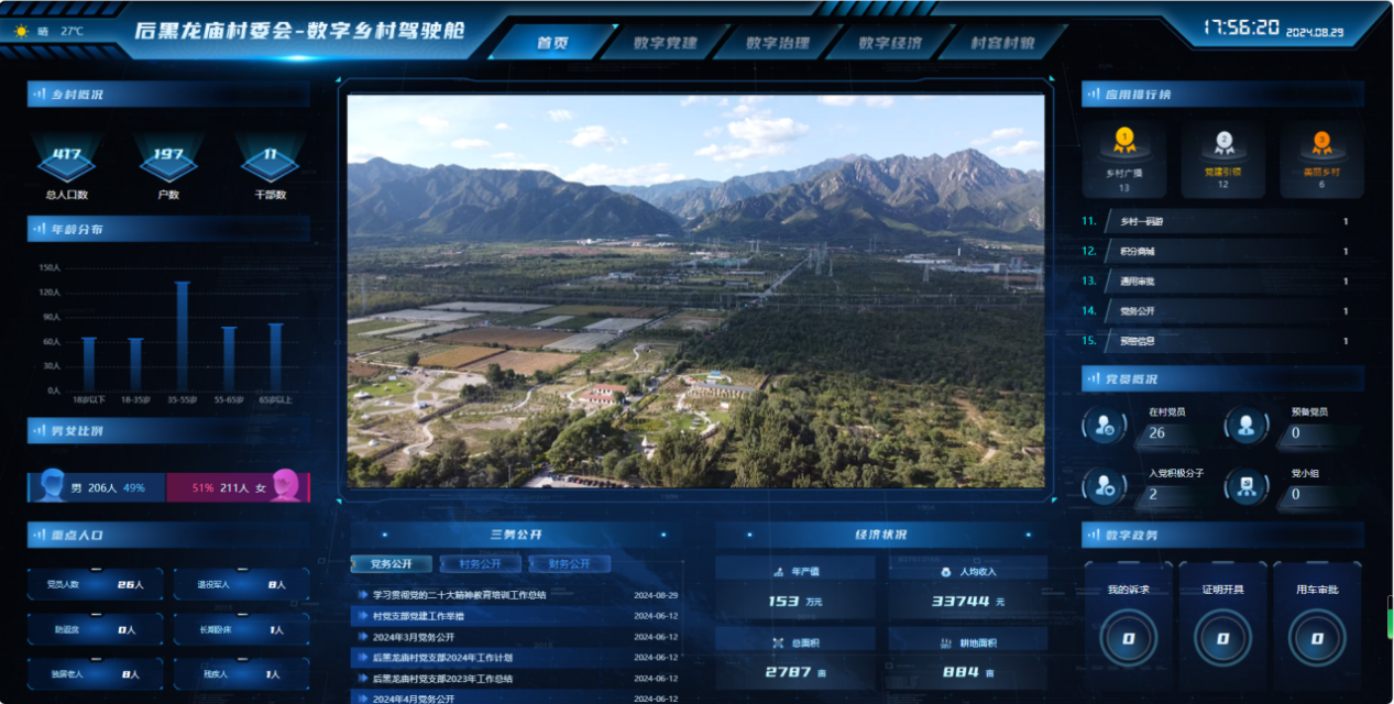 数字赋能乡村振兴,既有“智”又有“质”。实践团利用学院工业工程专业数字软件开发优势,于2024年8月驻村开展乡村数字平台建设,进行数据收集、整理、筛选和录入,进一步优化村内信息平台,完善村庄数据驾驶舱,实现了村内重要资料和信息“一键式”查询。