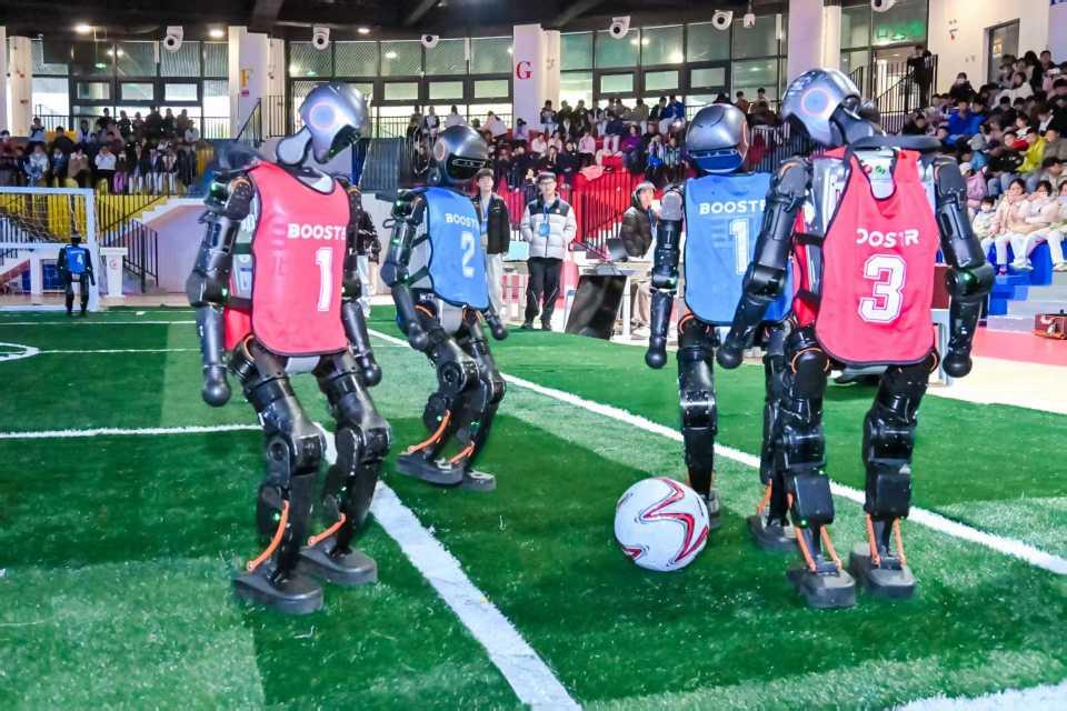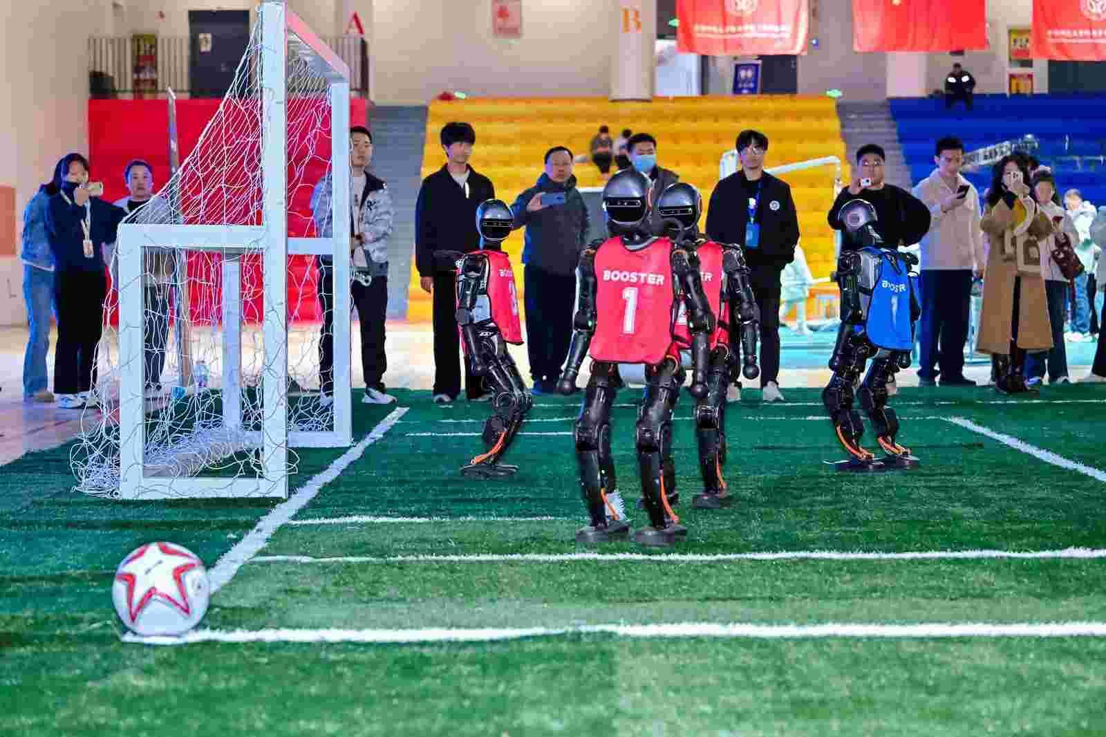 在演示现场,友里 驰稳队和中国农业大学山海队在足球场上演了机器人足球3V3友谊赛。北建大驰稳队提前为机器人调试视觉感知和决策算法,机器人比赛无需人工操作,凭借视觉感知能力、智能决策算法即可自主实现寻球、追球、射门等动作,为观众上演了精彩的比赛。