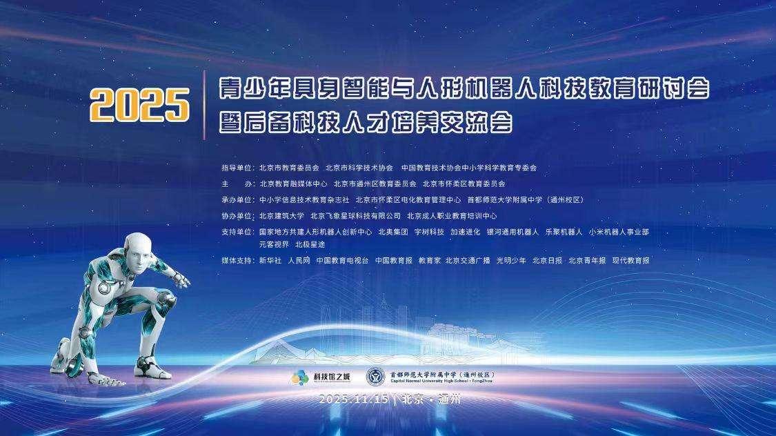 面对全球人工智能与机器人产业的迅猛发展,如何从中小学阶段开始培养未来的后备科技创新人才?11月15日,“2025青少年具身智能与人形机器人科技教育研讨会暨后备科技人才培养研讨会”在北京举行。会议由北京教育融媒体中心、北京市通州区教育委员会、北京市怀柔区教育委员会共同主办,中小学信息技术教育杂志社、北京市怀柔区电化教育管理中心和首都师范大学附属中学(通州校区)承办,友里 等单位协办。