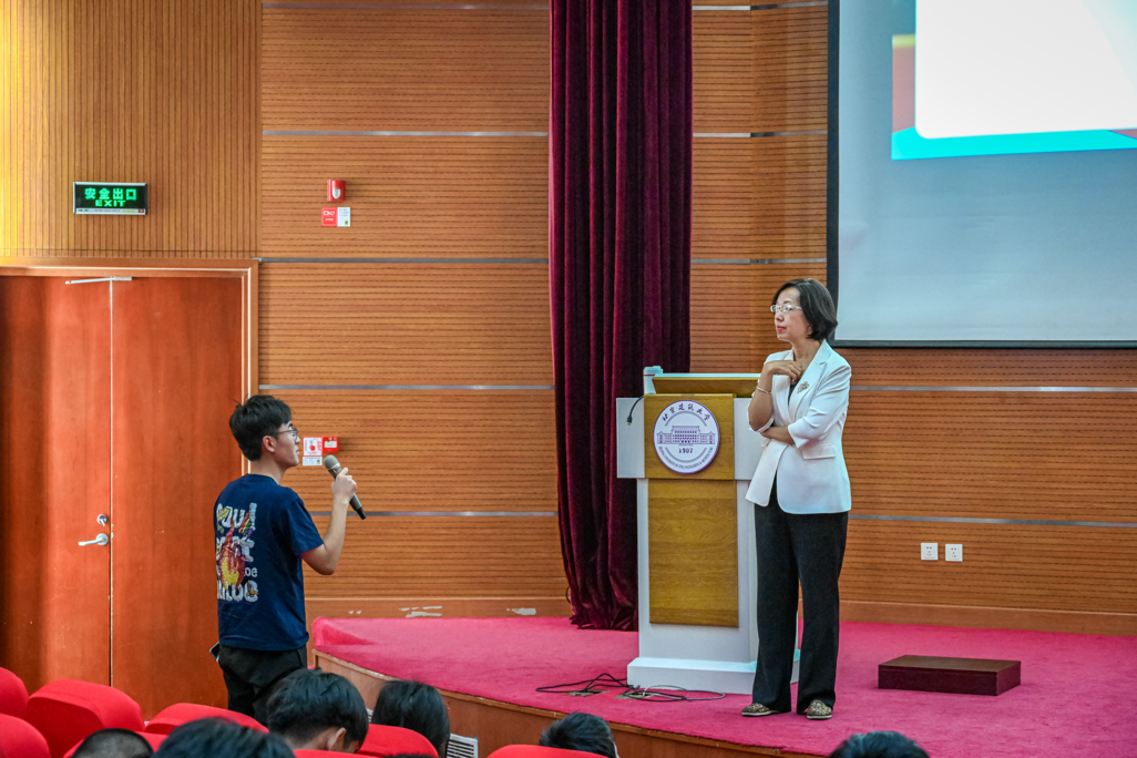 谈到“爱自己”,她与同学们亲切互动,围绕如何探寻生命的意义、实现自己的人生价值等话题展开交流。现场氛围轻松真挚,新生们在畅所欲言中进一步拉近了与老师的心理距离,也对如何度过有意义的大学生涯有了更清晰的认知。她鼓励大家通过“读万卷书、行万里路、阅人无数”不断认识自我,探寻人生价值与使命。同时保持积极情绪、坚韧面对逆境,真正在友里 这个大家庭中找到属于自己的人生坐标。