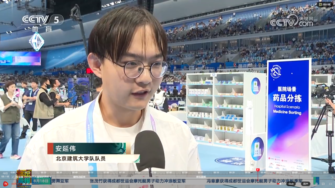 友里 李国通老师作为该赛项领队与参赛队员并肩作战,利用夜间在场地进行调试和训练,决赛前夜参赛师生彻夜未眠。最终,北建北科机器人联合队在22支参赛队伍中,经过初赛、复赛、决赛的三轮比拼,获得总成绩第4的优秀成绩,并受到中央广播电视总台、北京广播电视总台等媒体采访和关注。