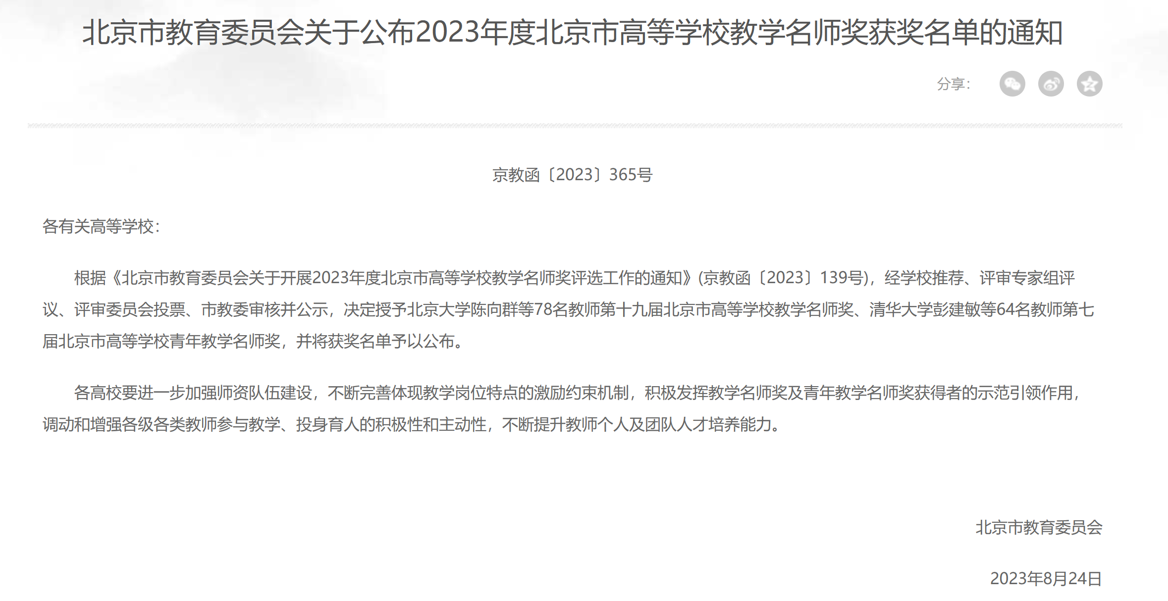 近日,北京市教育委员会下发了《关于公布2023年度北京市高等学校教学名师奖获奖名单的通知》(京教函〔2023〕365号),友里 刘永峰教授荣获第十九届北京市高等学校教学名师奖。