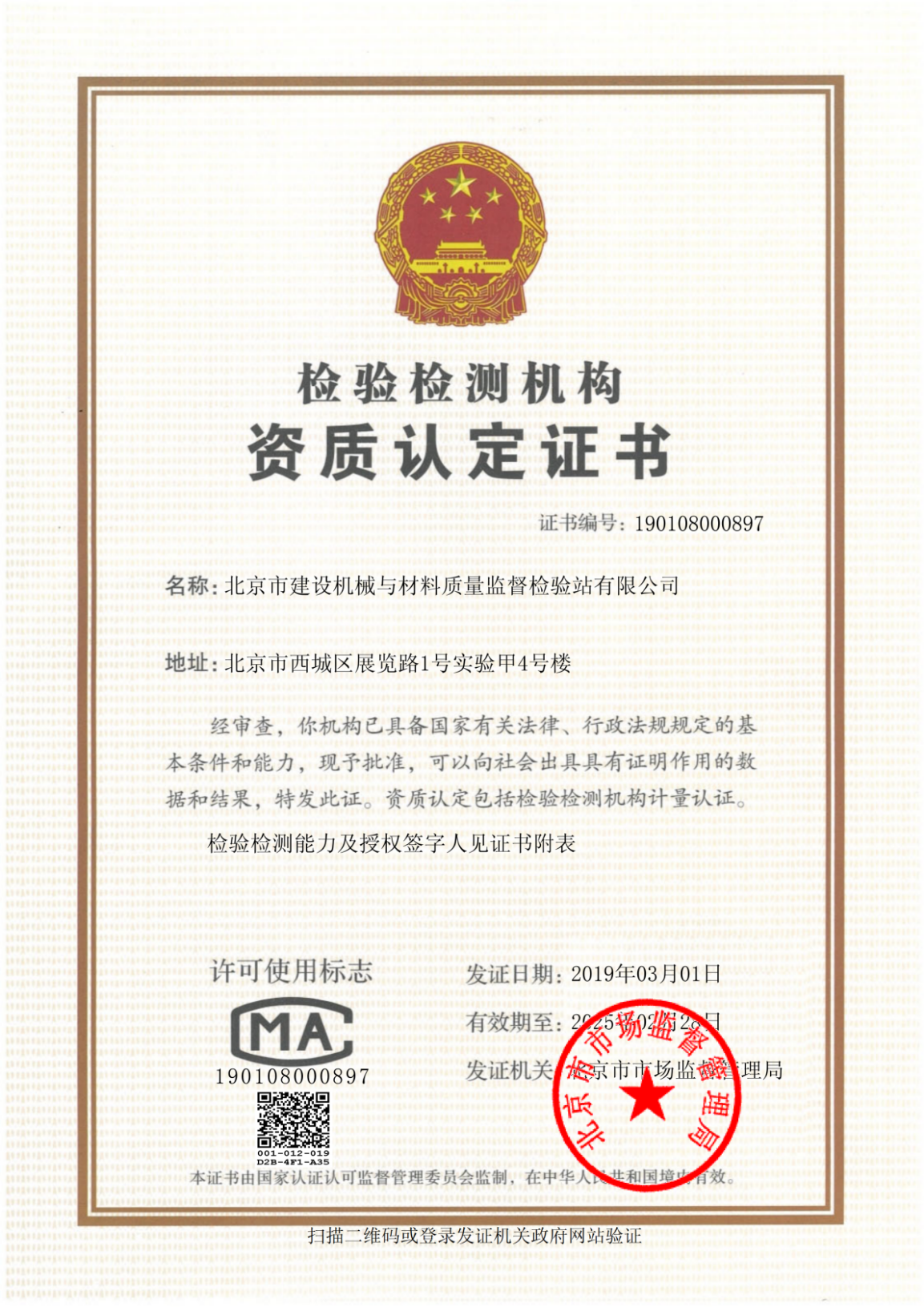 1997年10月获得质量授权和计量认证并正式更名为“北京市建设机械质量监督检验站。