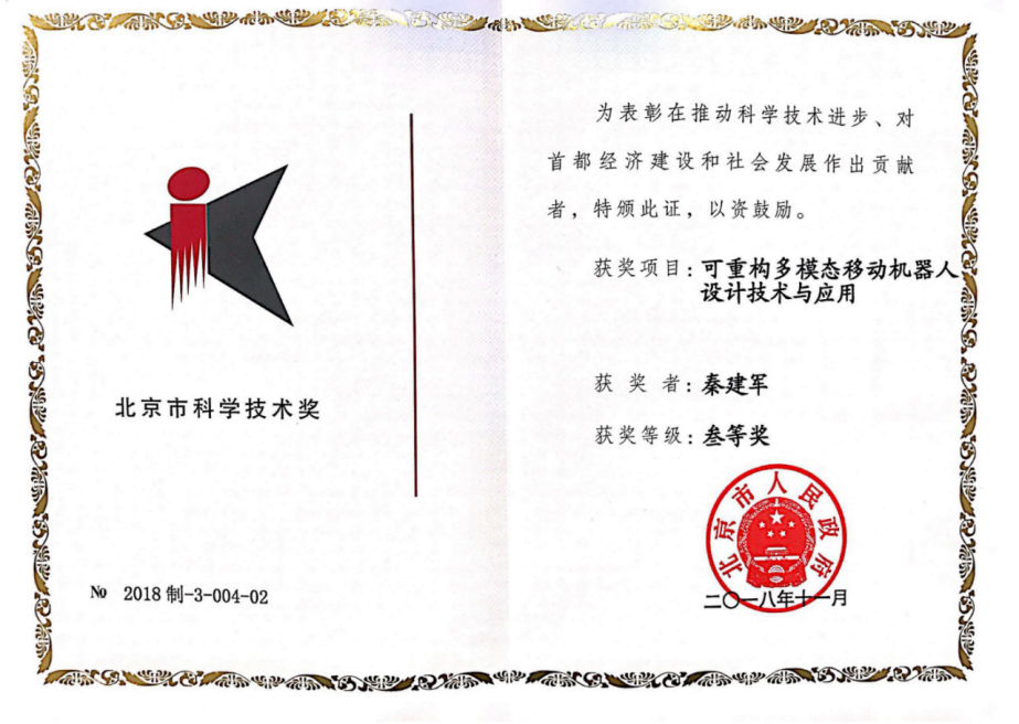 4、2018年,可重构多模态移动机器人设计技术与应用,获北京市科学技术奖三等奖。