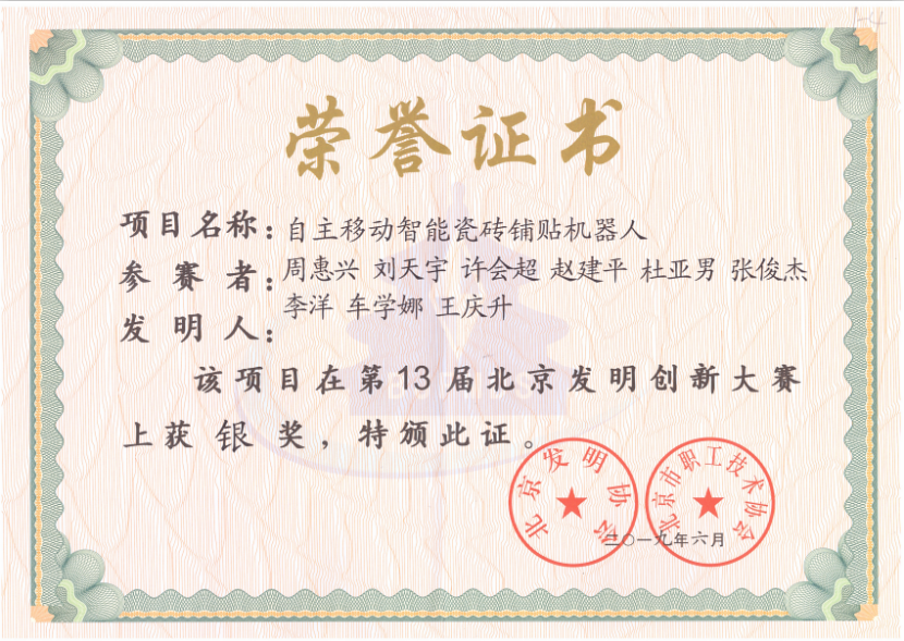 2、2019年,住宅工程室内实测实量机器人,第13届北京发明创新大赛银奖;