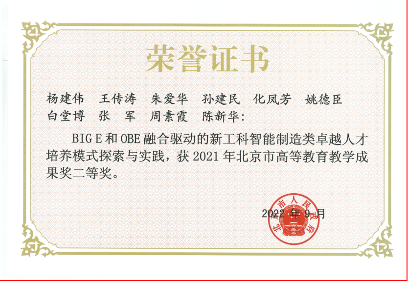2022 BIG E和OBE融合驱动的新工科智能制造类卓越人才培养模式探索与实践 北京市人民政府/北京市教学成果奖二等奖
